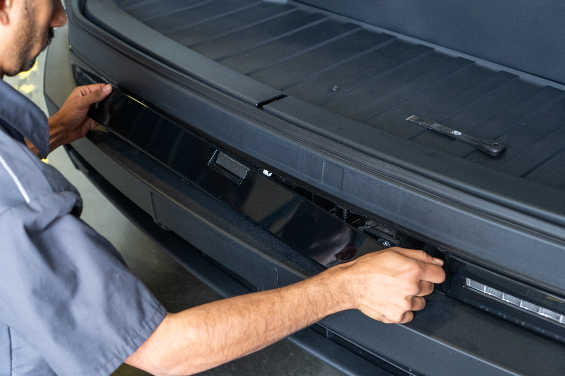 Using a pry tool, disengage all 6 clips securing the cover behind the front license plate mount and remove it from the front bumper cover in order to access the front camera.