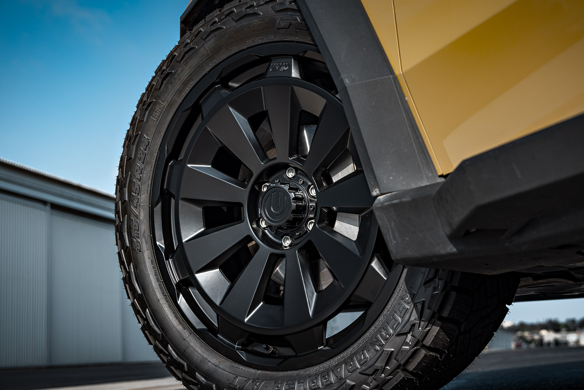 - Unique 9-spoke multi-layered design shows off the Tesla Cybertruck’s straight-edged lines throughout, in a geometric explosion