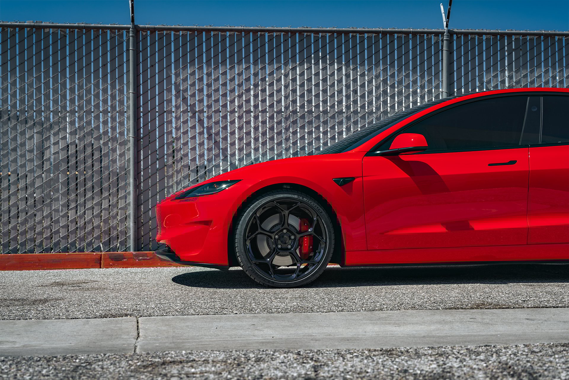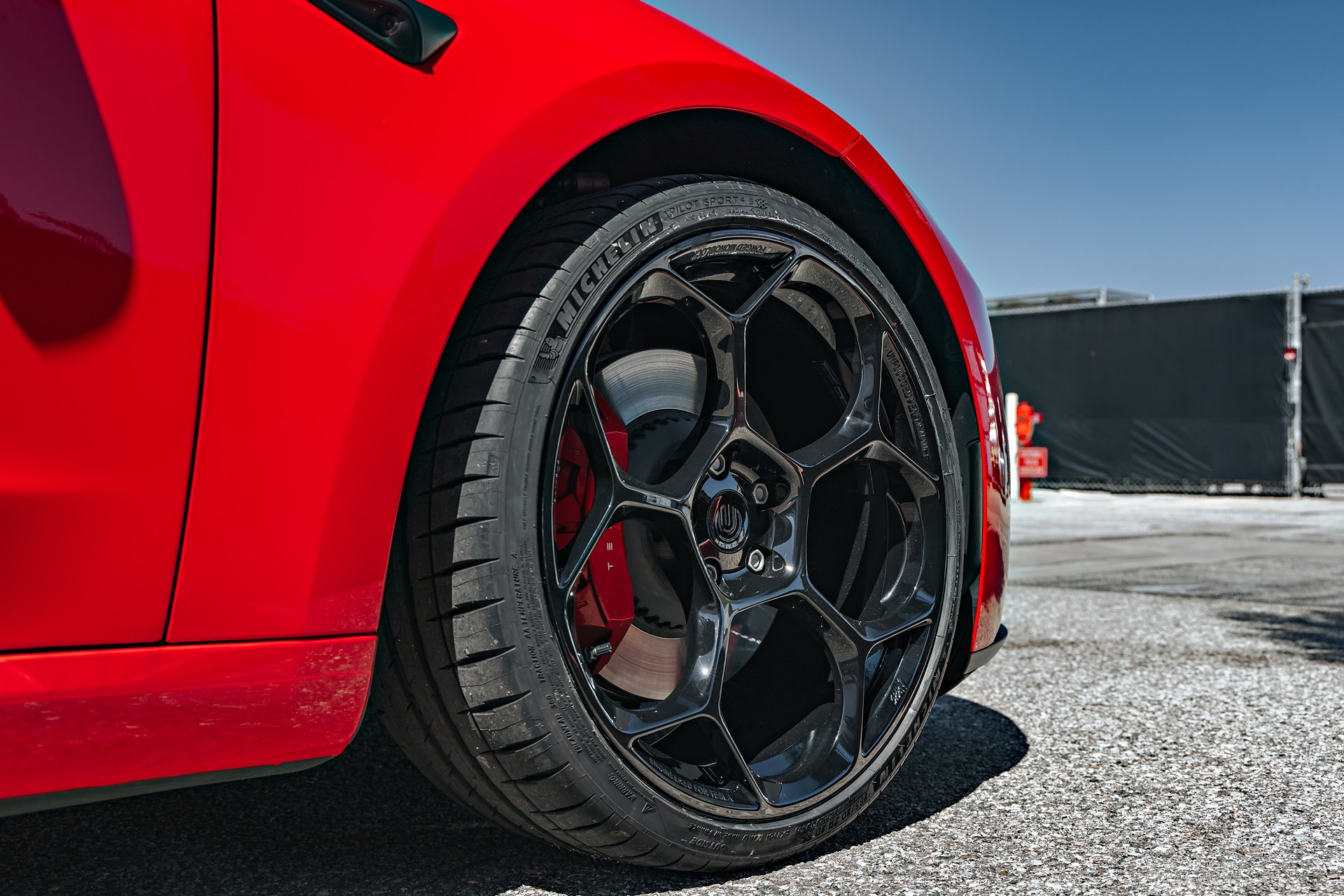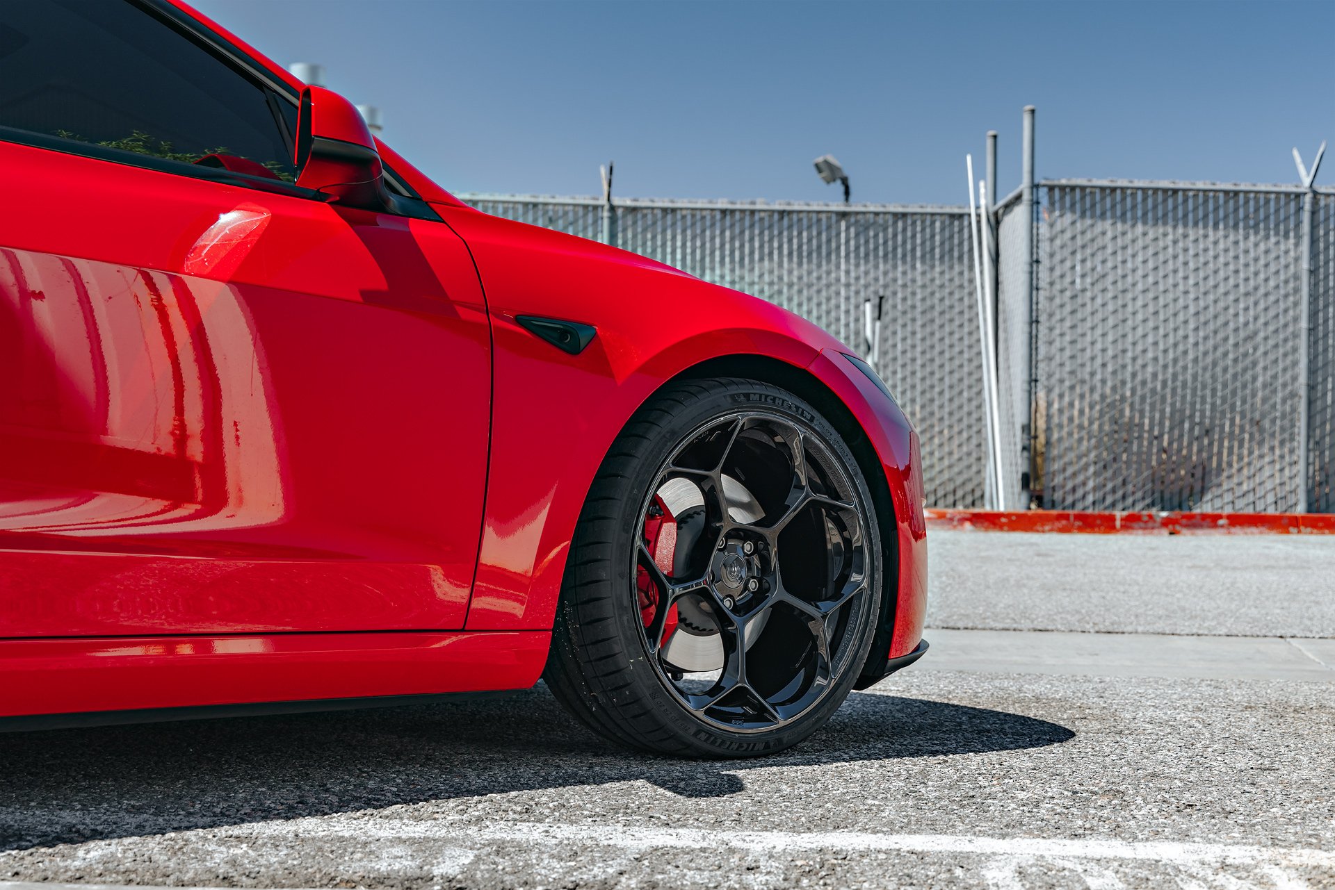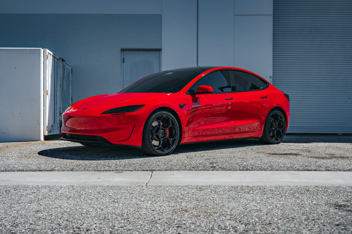 Bright Red 2024 Tesla Model 3 Performance 20 inch UP-05 Wheels in Gloss Black