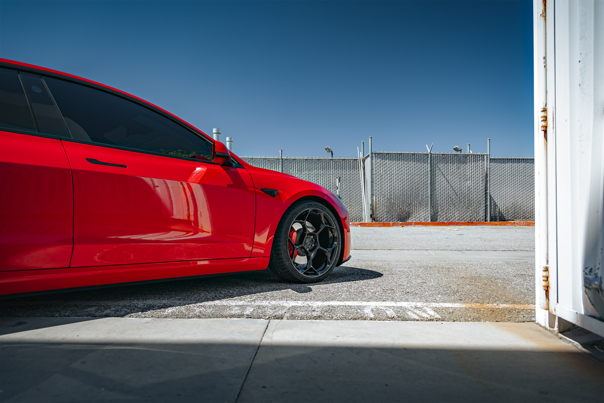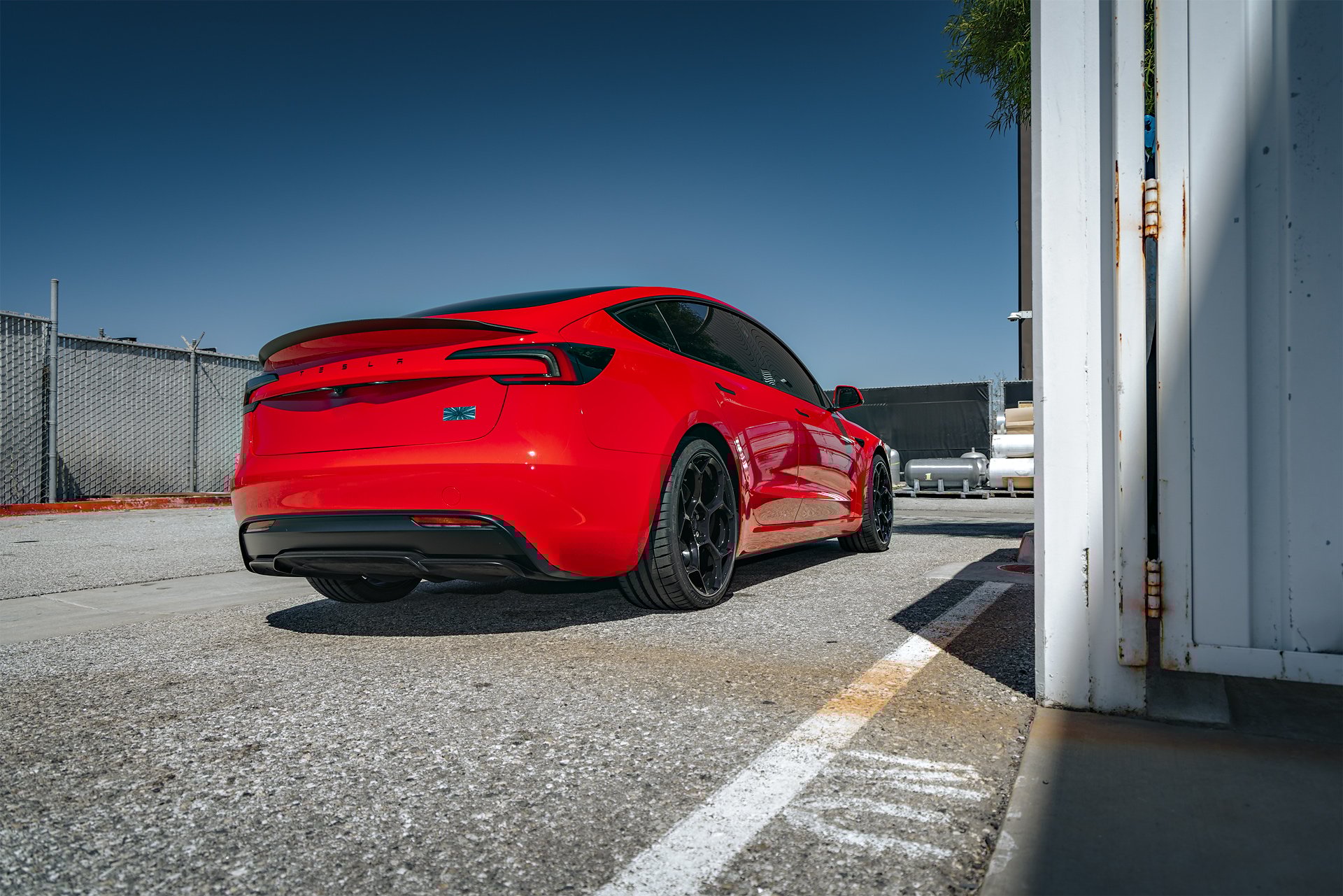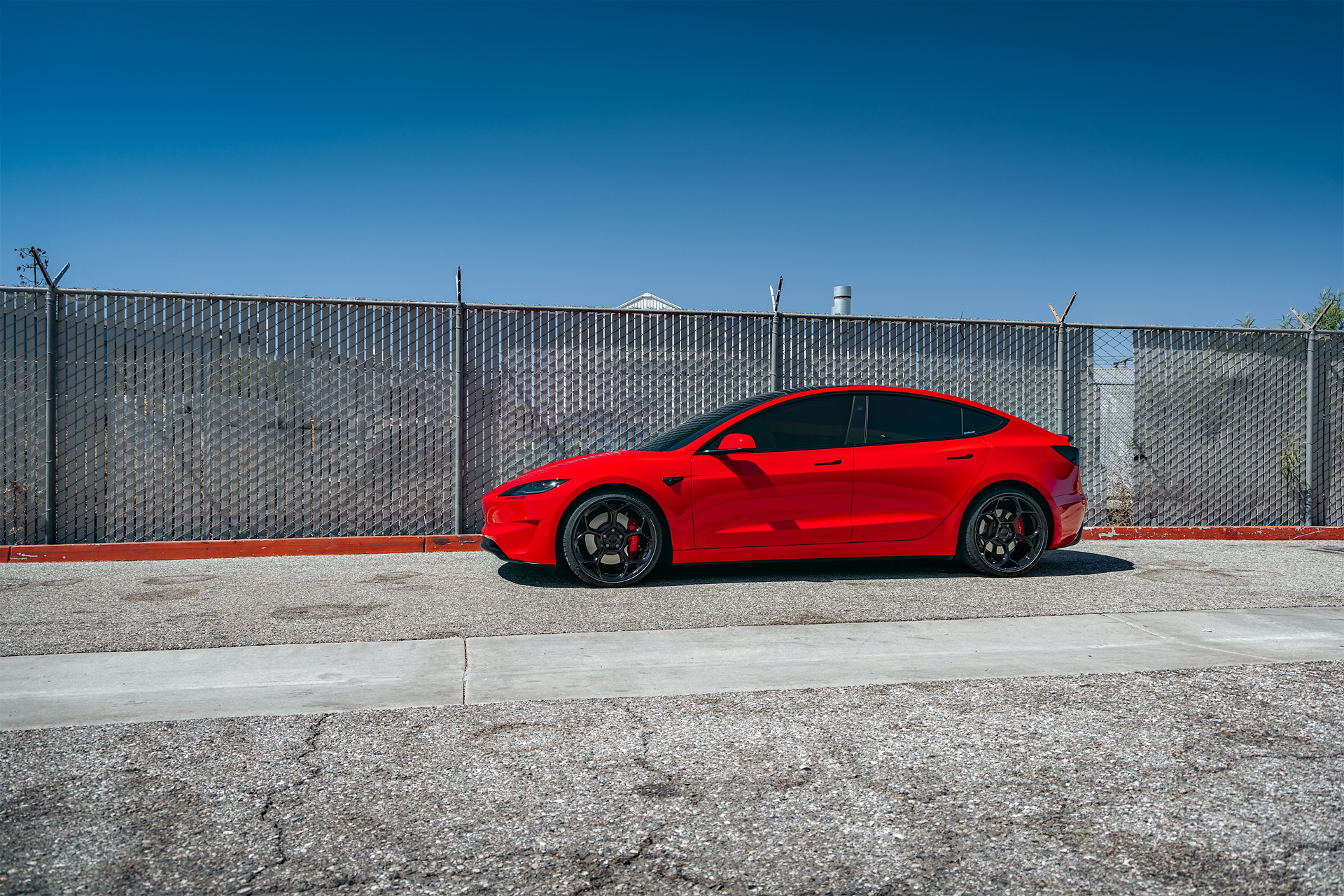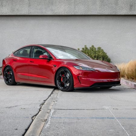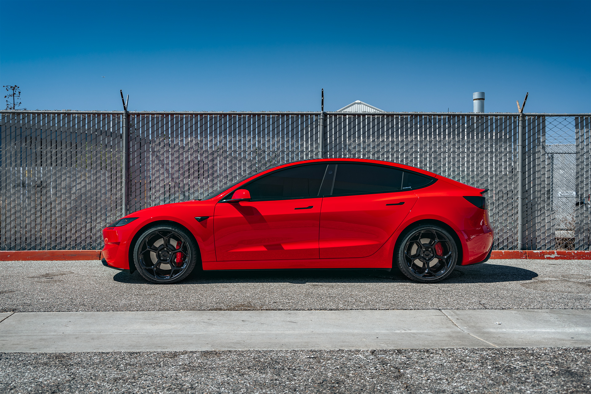 Bright Red 2024 Tesla Model 3 Performance 20 inch UP-05 Wheels in Gloss Black