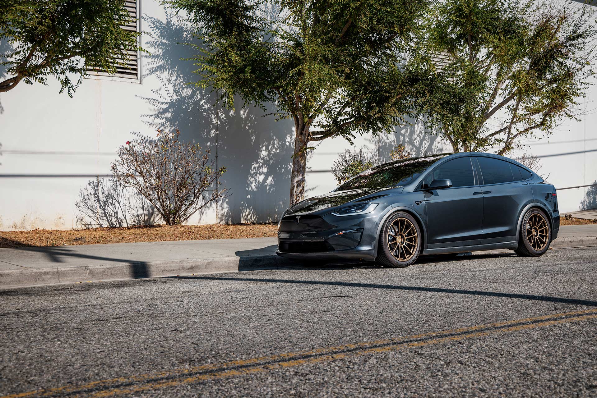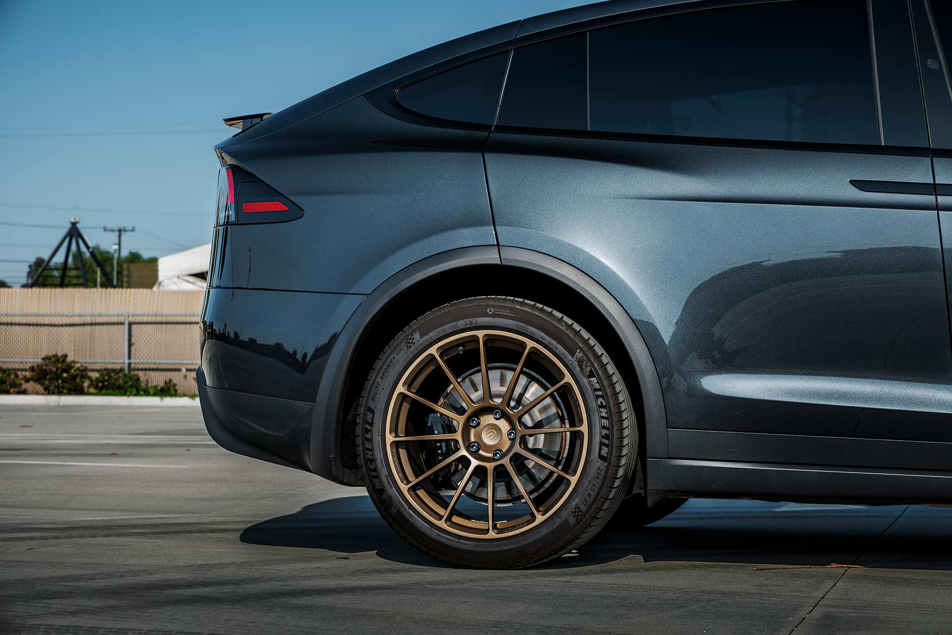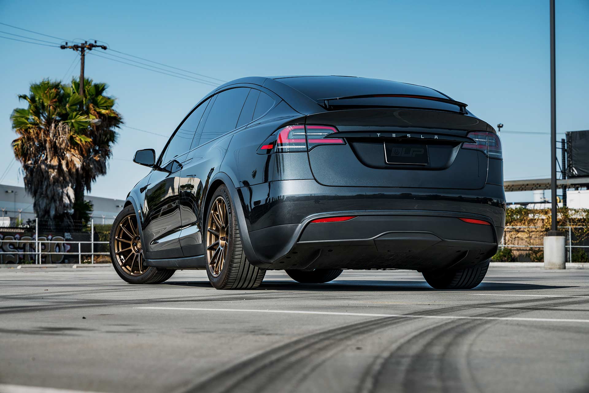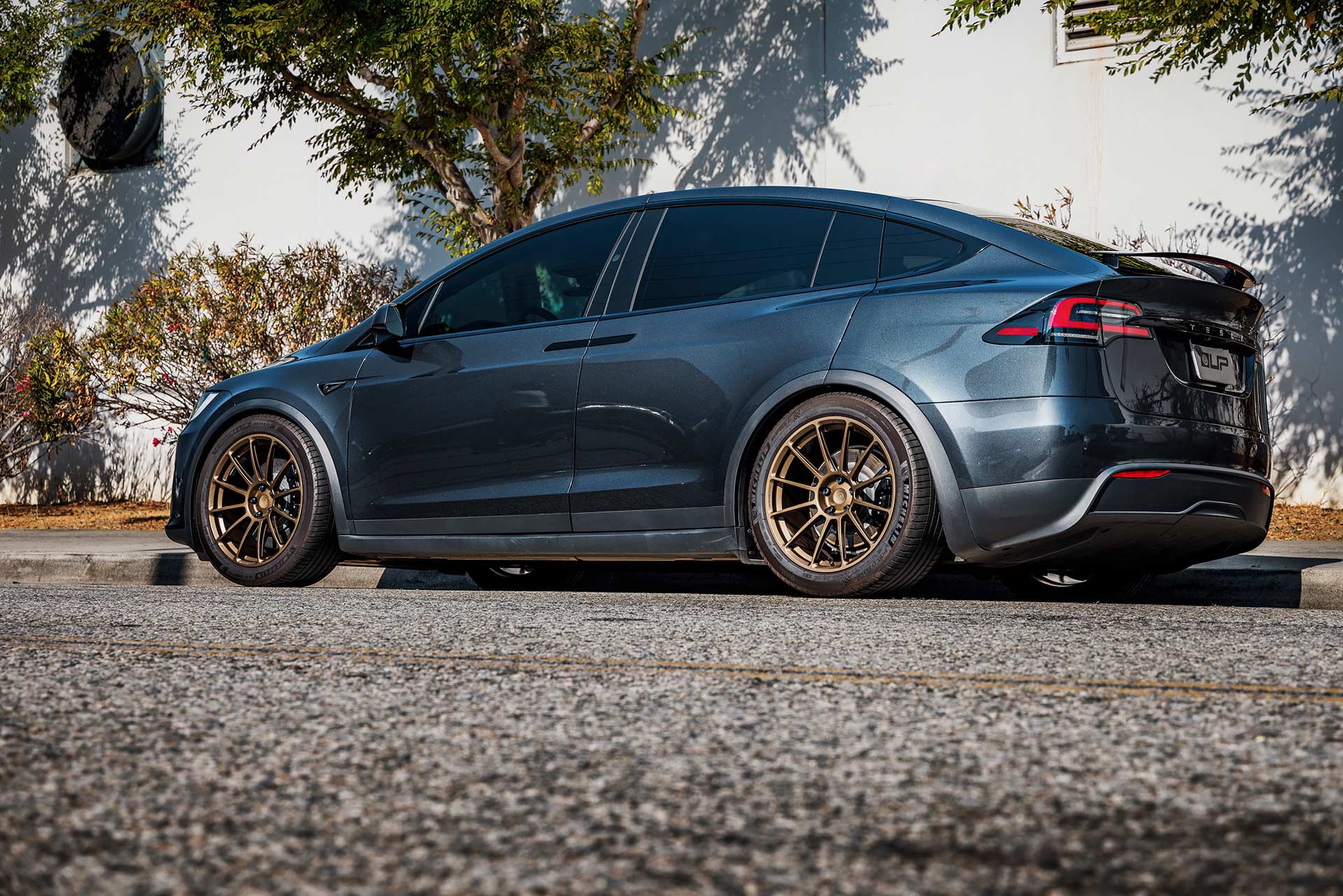 Next came UP Forged UP-03 wheels. Forged 6061 T6 construction keeps weight down and strength up, which is exactly what a heavy performance SUV needs. The I beam spoke design resists flex under load and the knurled barrel improves tire grip under hard acceleration. Reduced wheel weight lowers unsprung mass and rotational inertia, which sharpens steering response and helps the suspension do its job over broken pavement. The visual effect matters too. In Stealth Grey, the UP 03 design lines give the Model X presence and talk about a great finish with the Satin Bronze! Park it at the curb and you will look back as you walk away. We know we would…