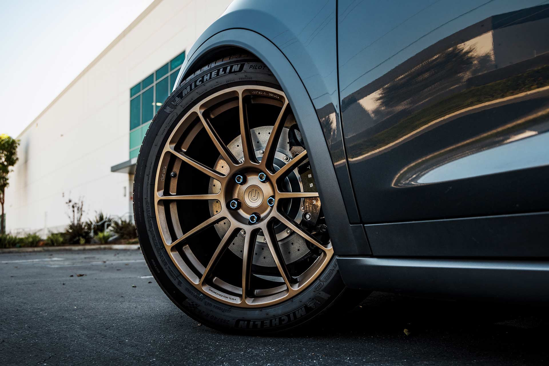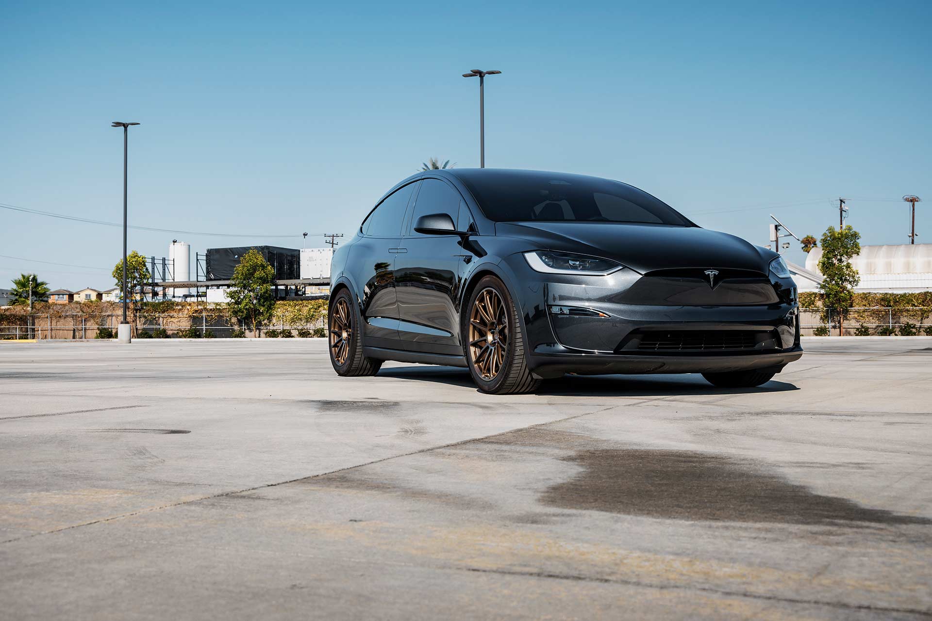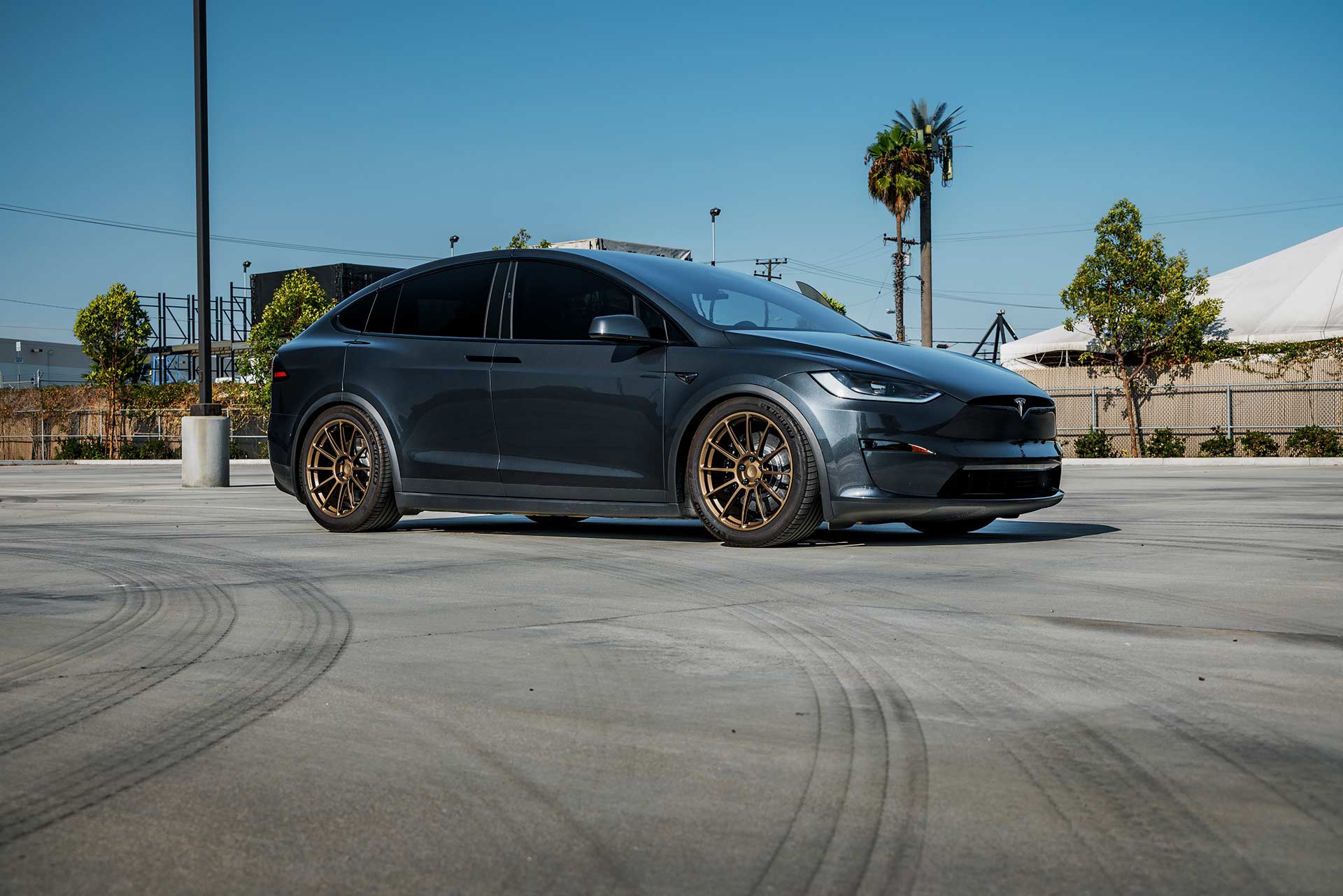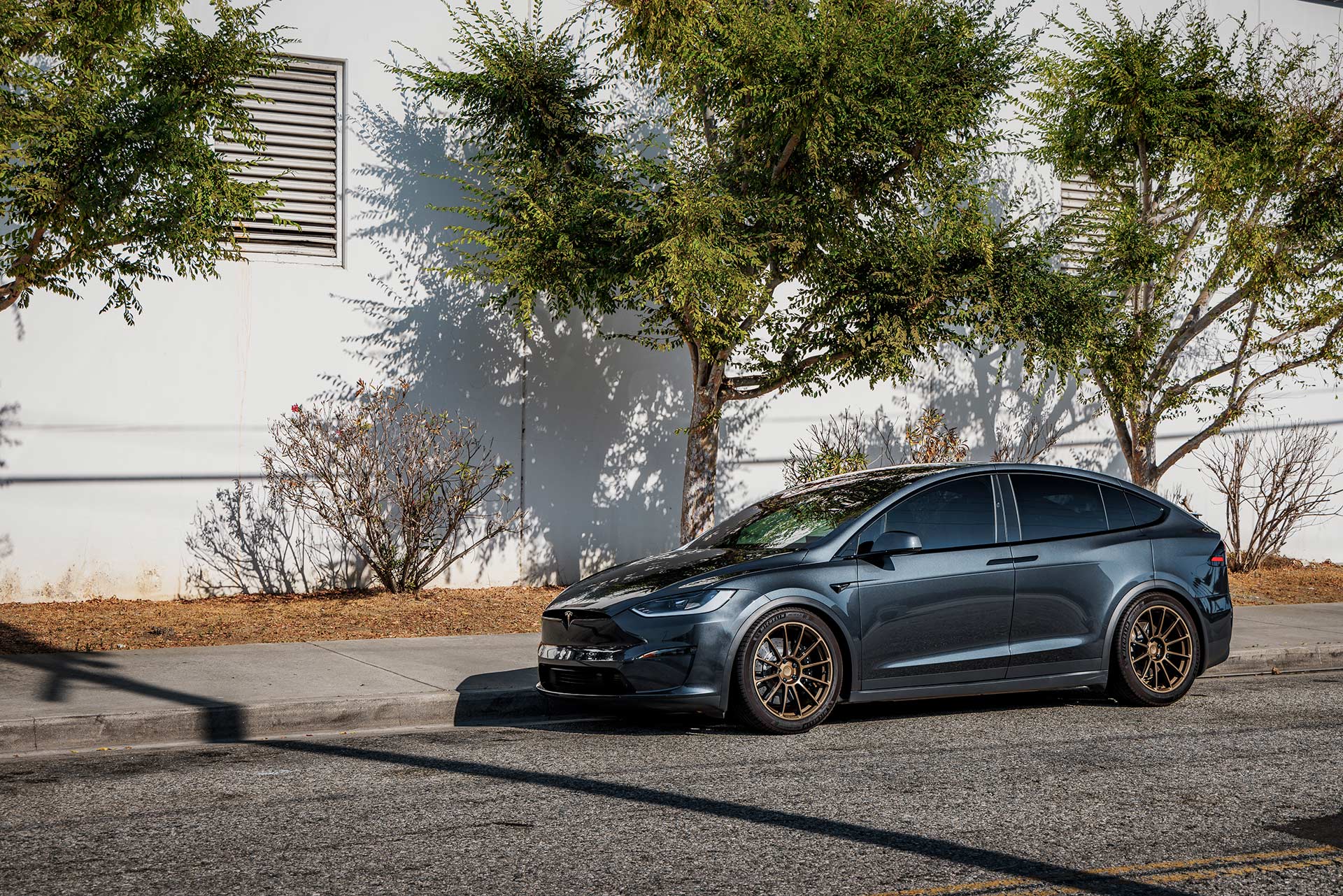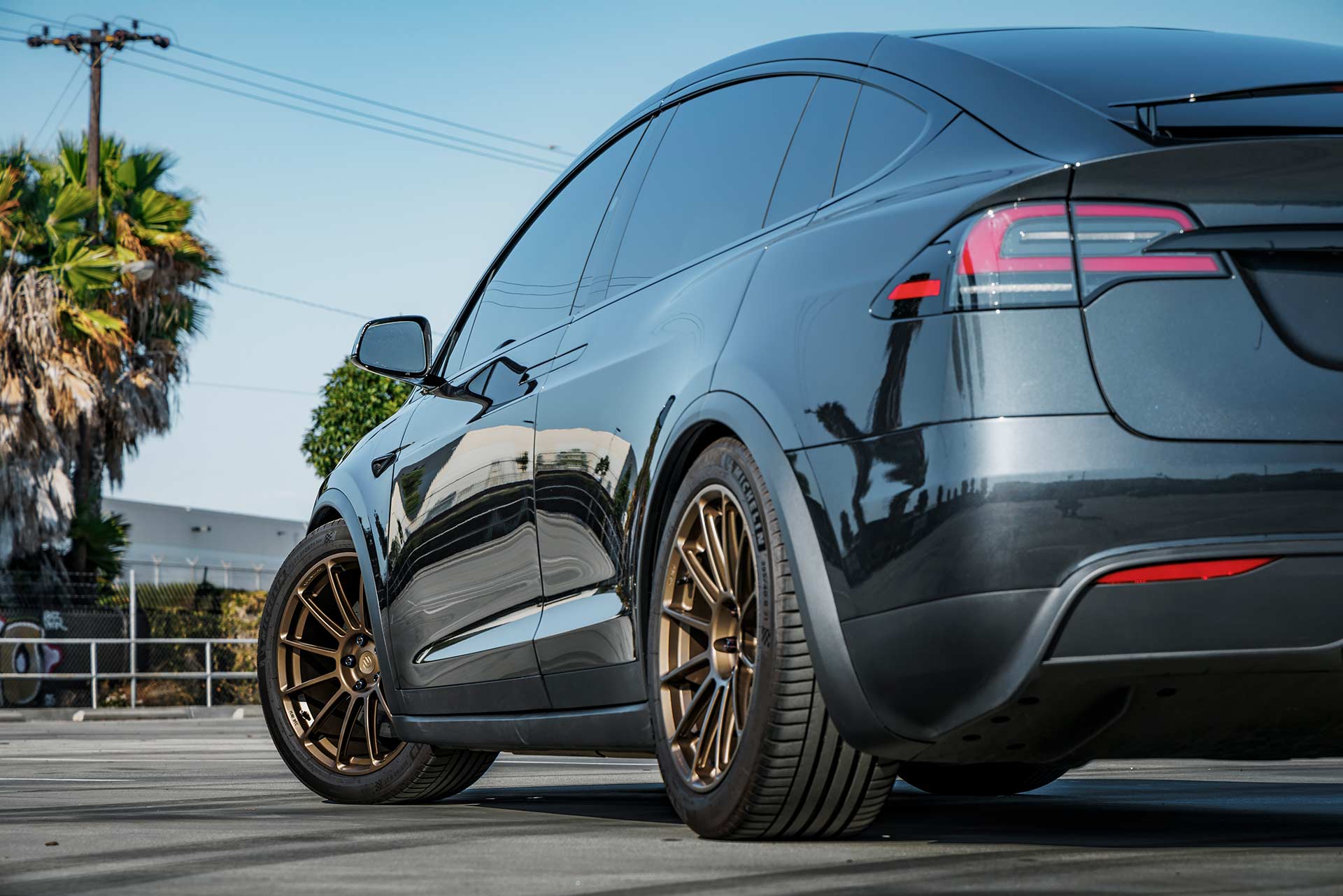 Next came UP Forged UP-03 wheels. Forged 6061 T6 construction keeps weight down and strength up, which is exactly what a heavy performance SUV needs. The I beam spoke design resists flex under load and the knurled barrel improves tire grip under hard acceleration. Reduced wheel weight lowers unsprung mass and rotational inertia, which sharpens steering response and helps the suspension do its job over broken pavement. The visual effect matters too. In Stealth Grey, the UP 03 design lines give the Model X presence and talk about a great finish with the Satin Bronze! Park it at the curb and you will look back as you walk away. We know we would…