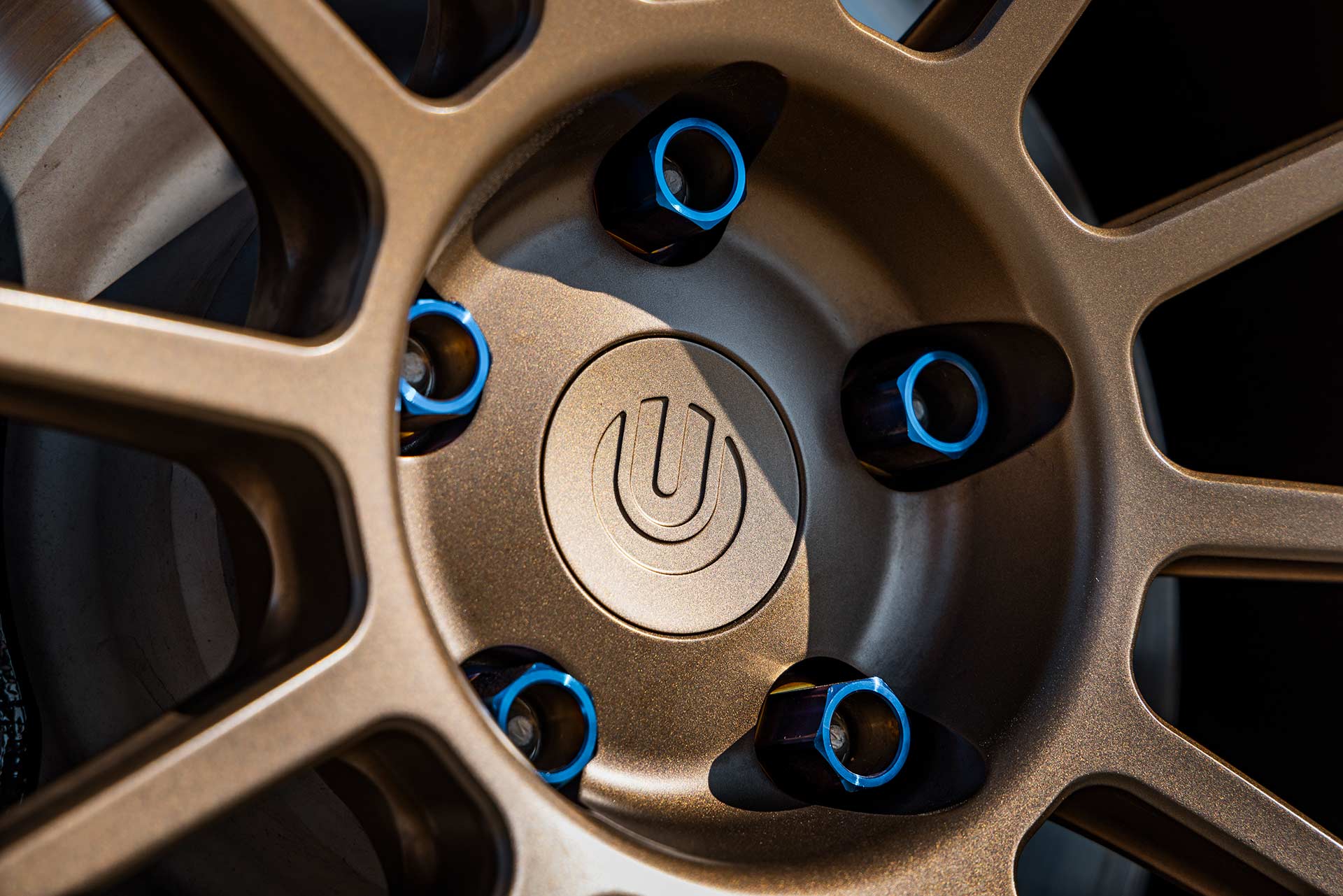 We went all in on reducing unsprung weight and that included the hardware that holds the wheels on. Our UP Superlight Titanium Lug Nut Set trims mass right where it matters, which helps steering feel, acceleration, and braking response. Unsprung weight is everything the suspension does not support, like wheels, rotors, tires, hubs, and lug nuts. Cutting weight here lets the suspension react faster and helps transfer motor power to the pavement more efficiently.
