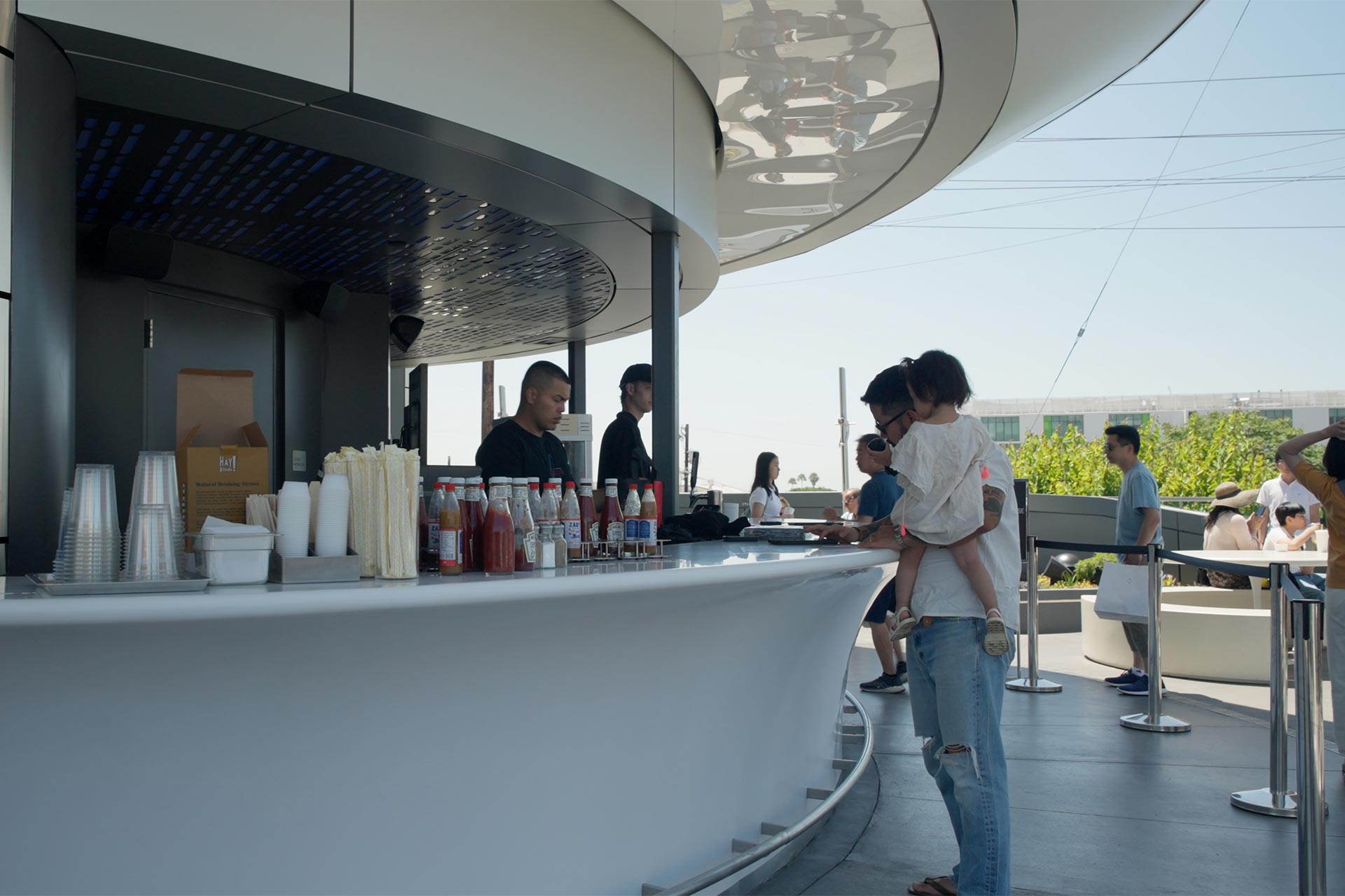 After lunch, we explored the buzzing diner, people watched as guests snapped photos, families lounging, kids staring all over the place in awe. Optimus on display drew plenty of attention. To go upstairs, you’re taken to an almost Alice in Wonderland-like set of stairs that spiral towards the top and eventually take you to the top floor of the diner. On the roof, there is ample amounts of seating that you can choose from with views of the large screens to enjoy your meal break in while your car charges.