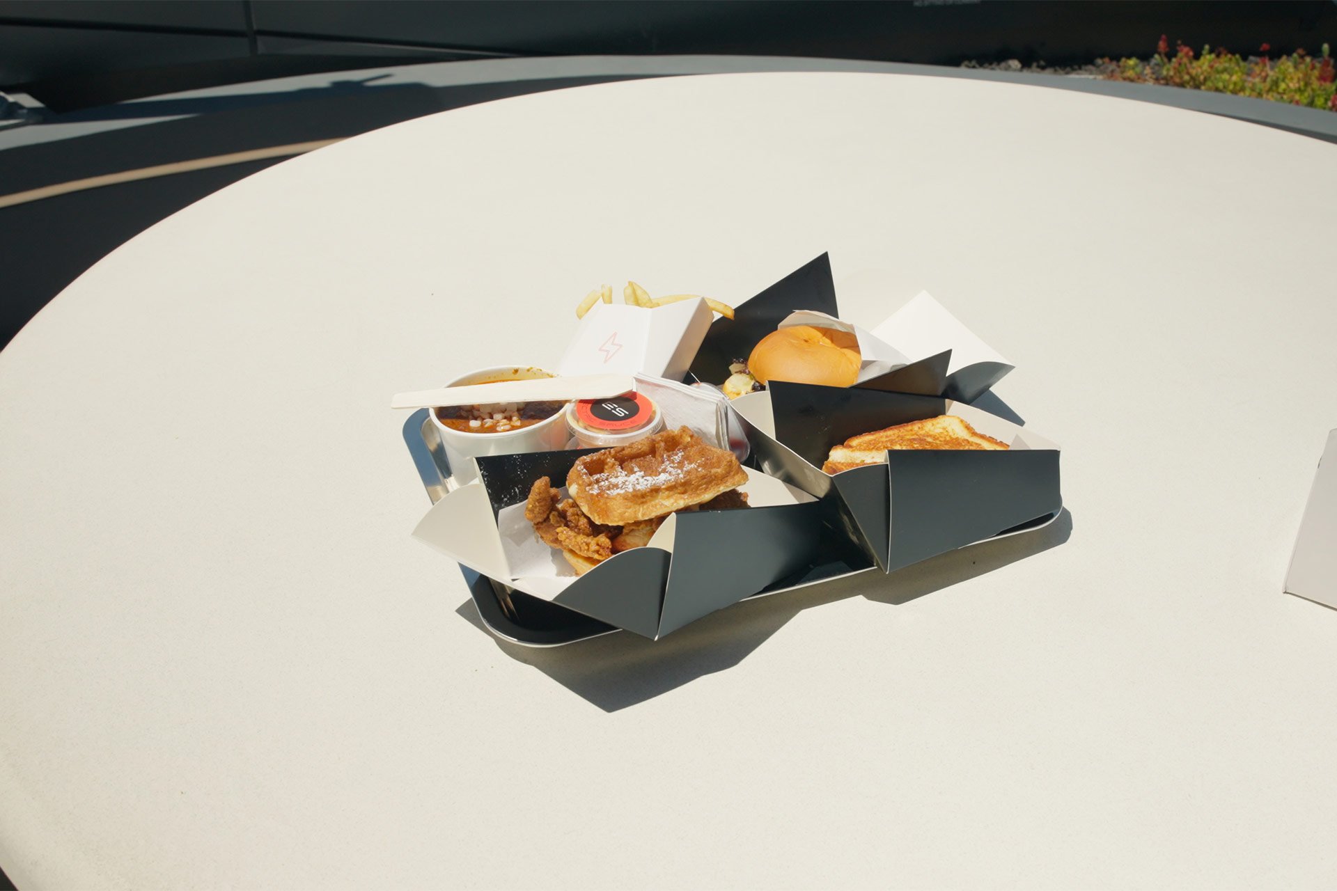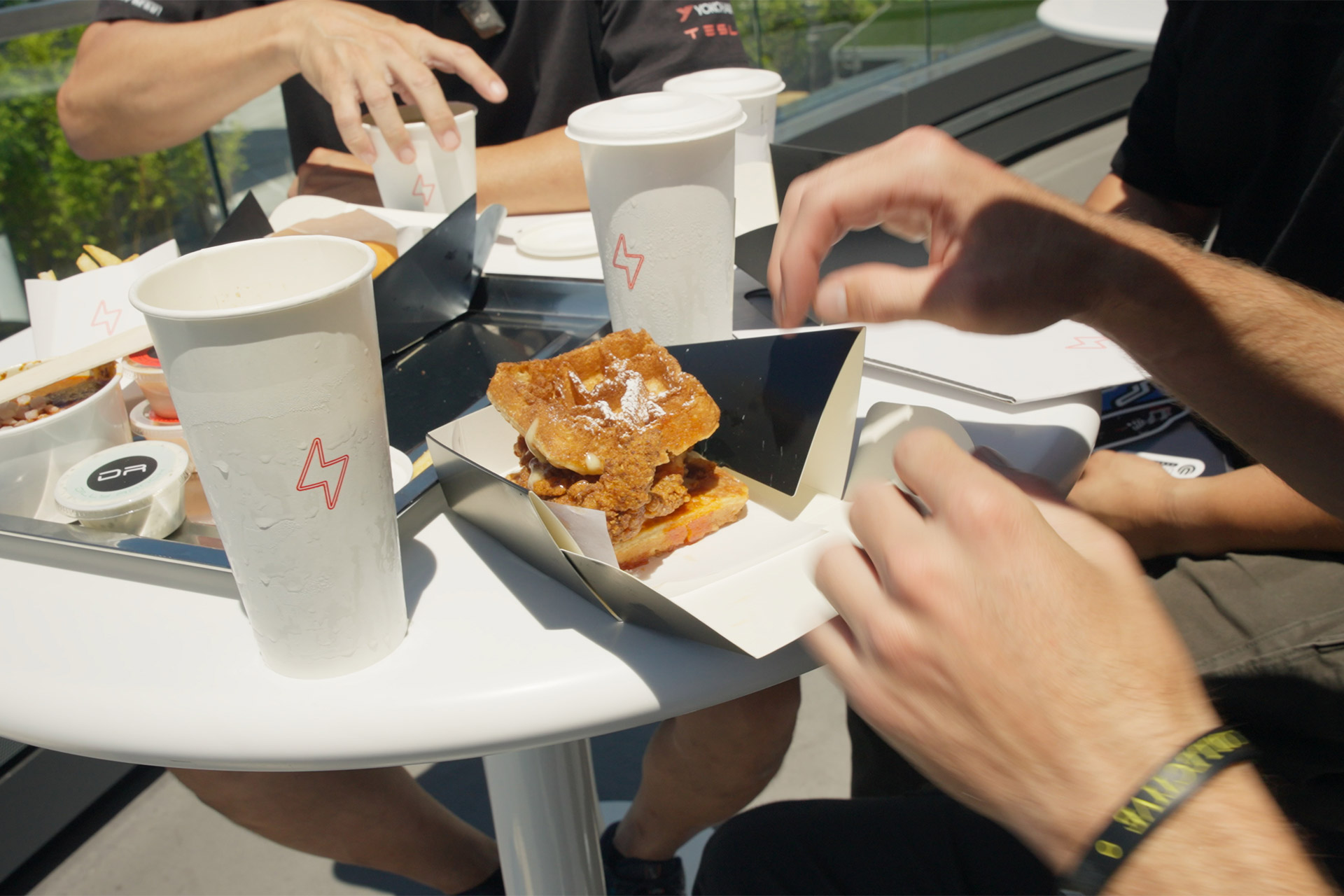 Inside, we scoped the menu and ordered easily via the kiosk to the left of the entrance. We’d also seen you can also order ahead if you’re charging, so your food awaits you when you pull in.