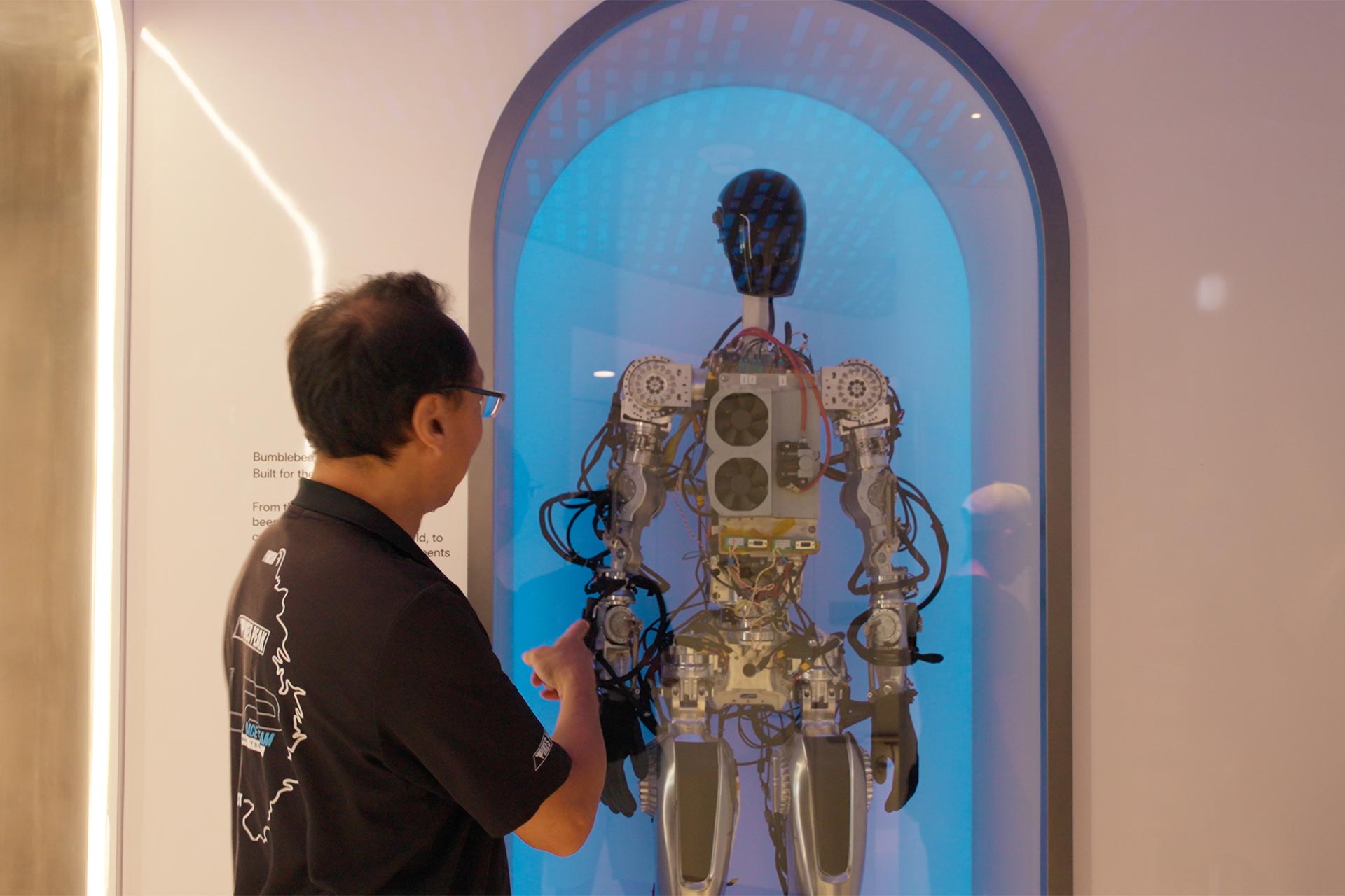 The diner has two massive 66‑foot outdoor LED screens project movies and vintage-style content, and the upper-level “Skypad” offers outdoor dining with great views. Themed touches are everywhere: when ordering, your food can arrive in animated Cybertruck themed boxes, Optimus is on display complete and also internally, plus you can view a few things like the infamous Cybertruck window scattering when the steel ball was thrown during its unveiling event. As for merchandise? Neon signs, apparel, Cybertruck toys, water bottles, and pins are on sale.