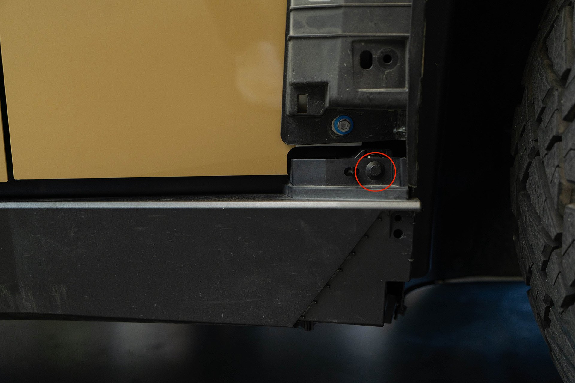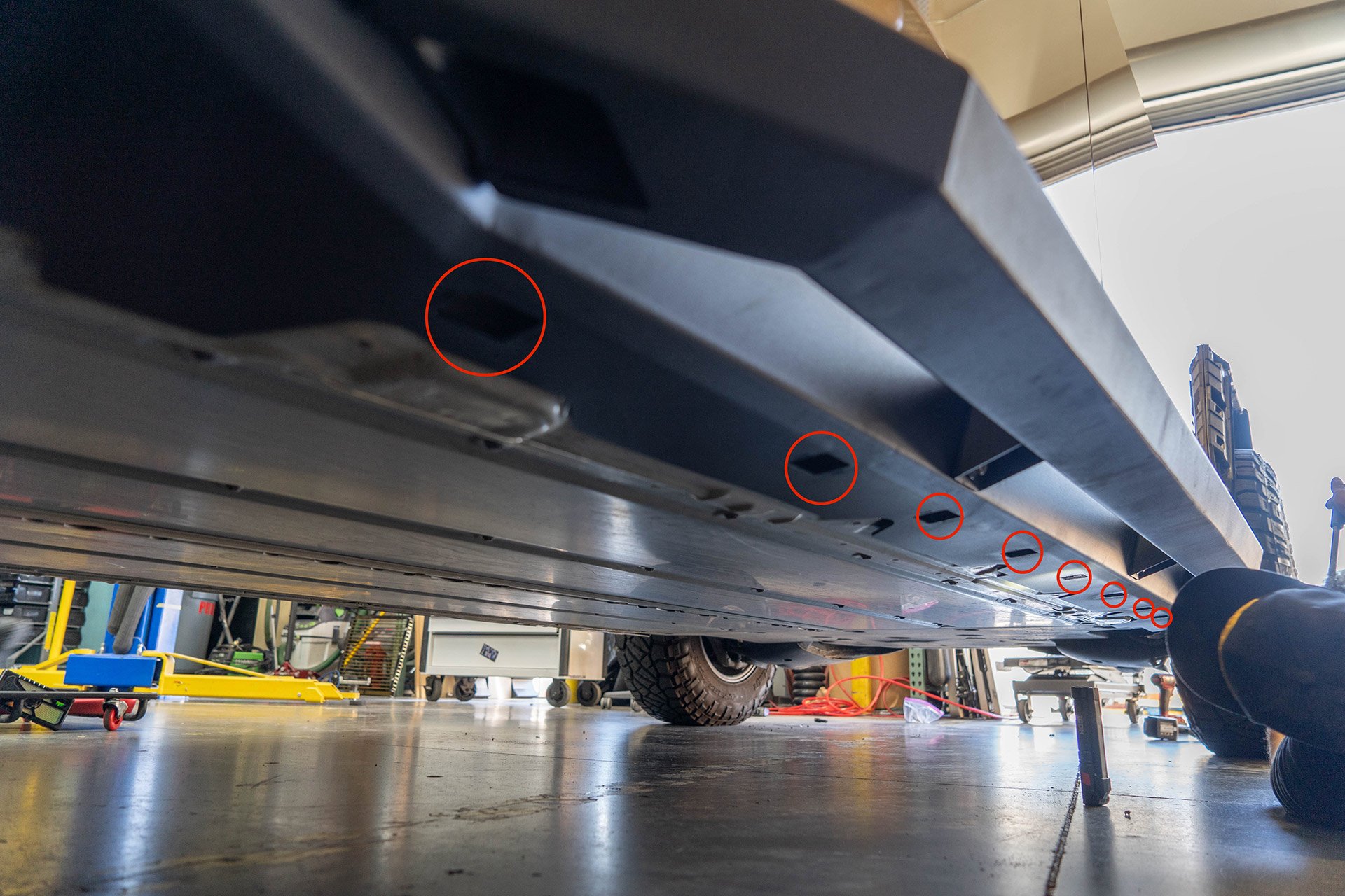 Once the Rock Slider is resting on the factory rail, check for proper alignment by verifying that each 10mm bolt slot line up with the mounting points on the chassis as shown below.