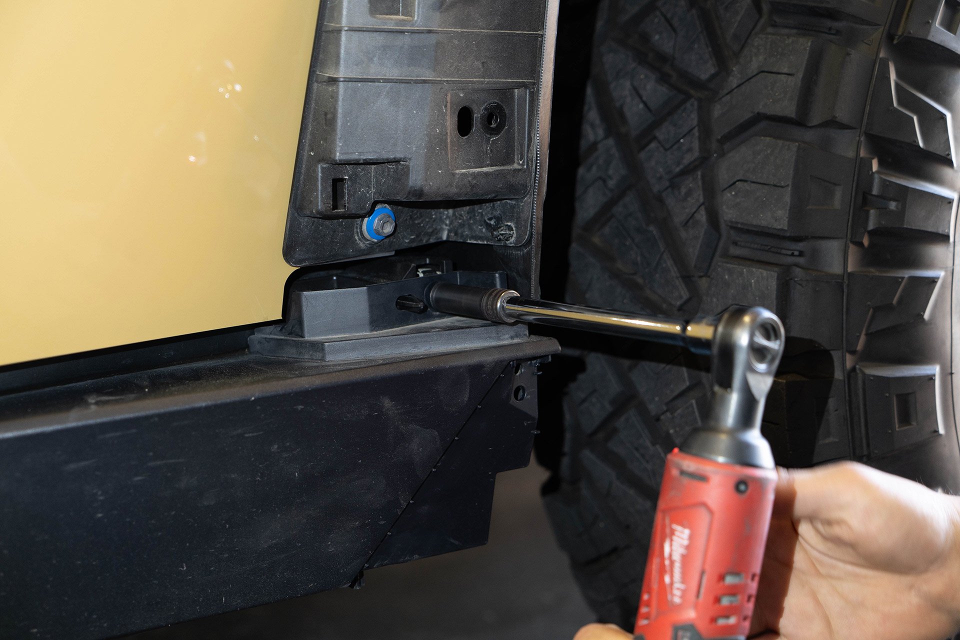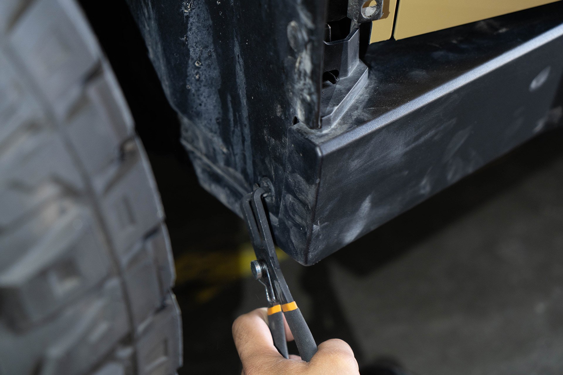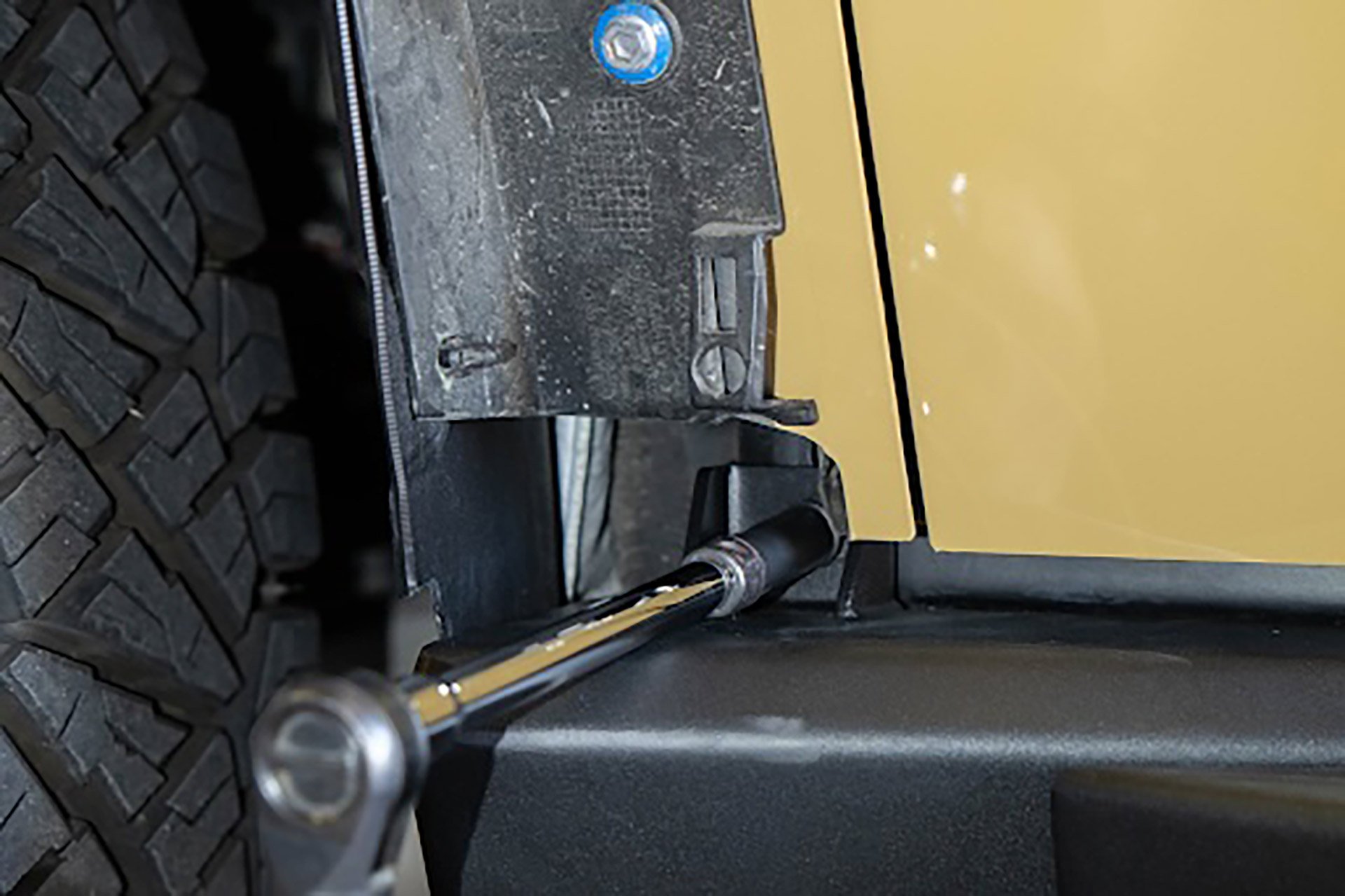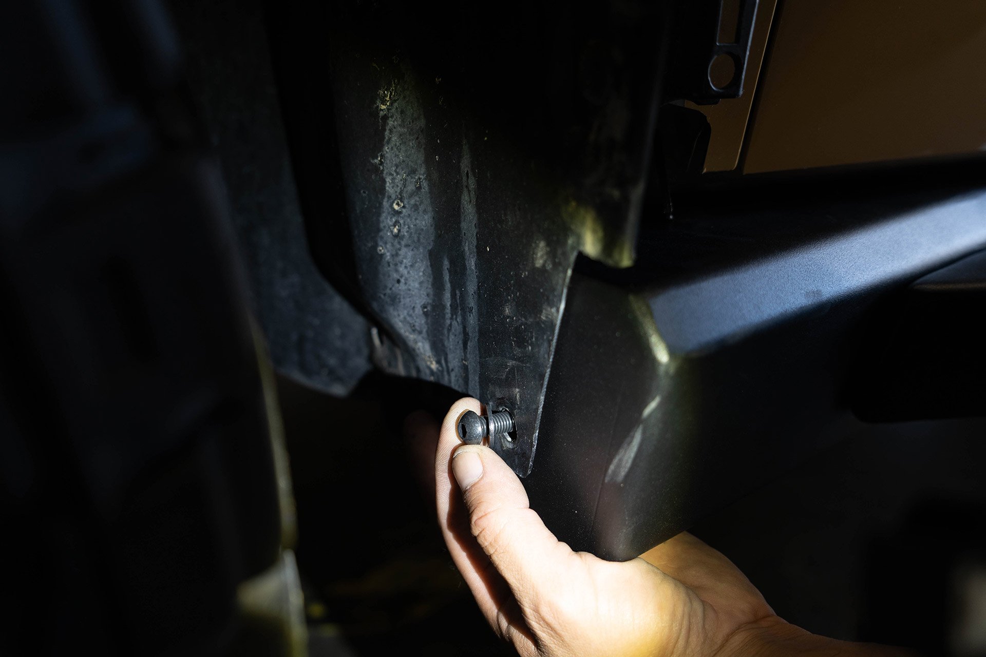 Next, install remaining factory push clips to secure the fender liner to the rock slider. Torque to 8 ft/lbs.