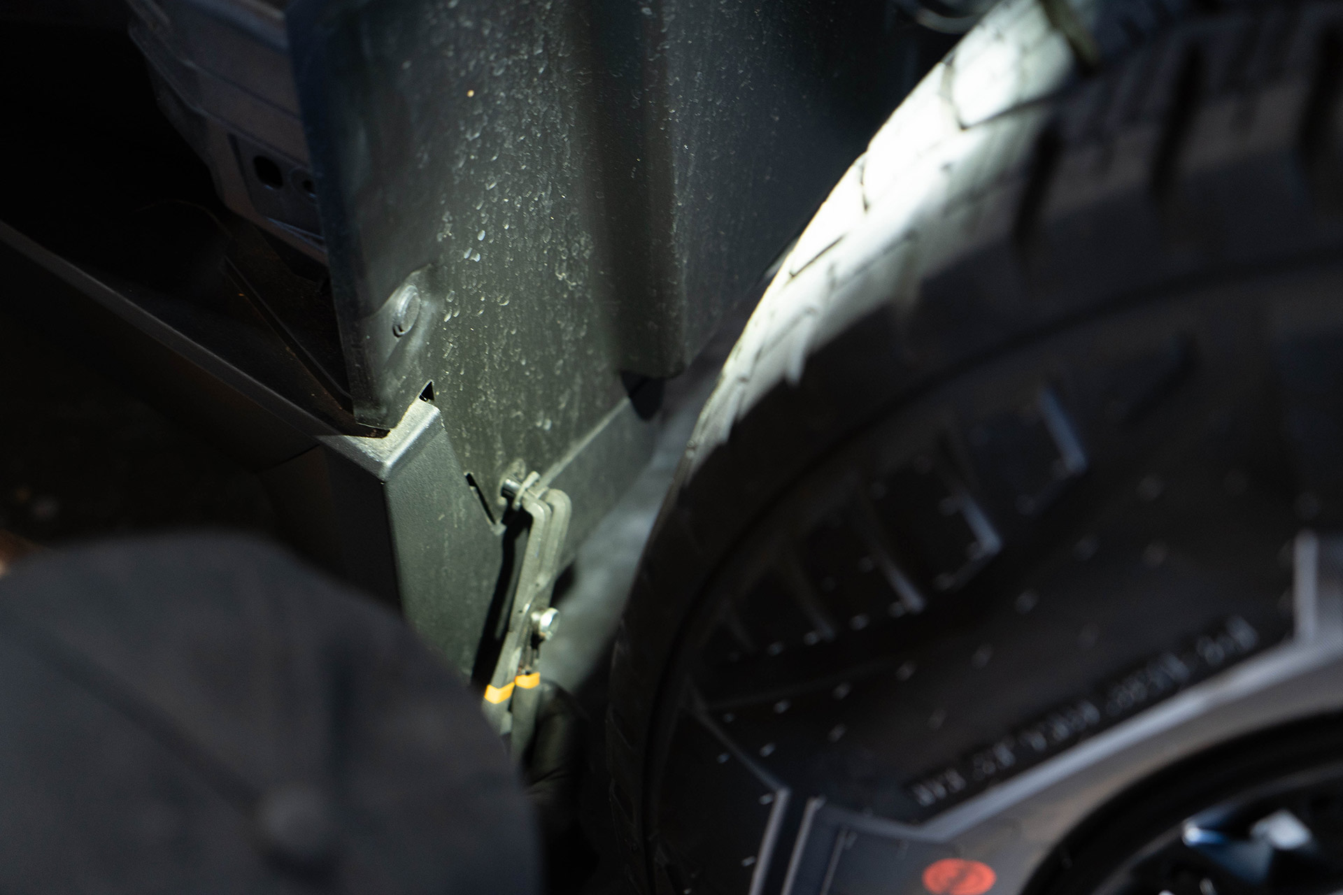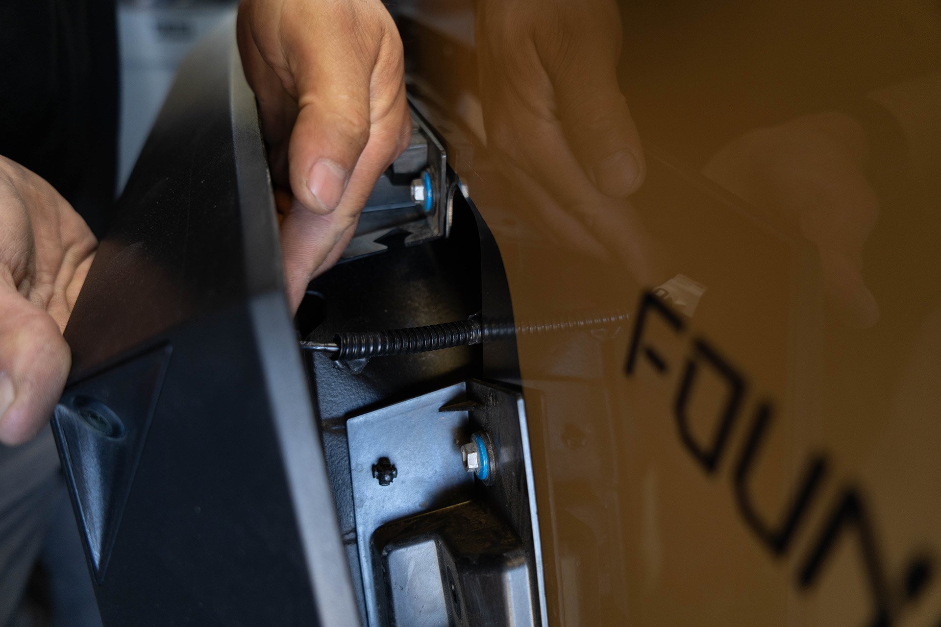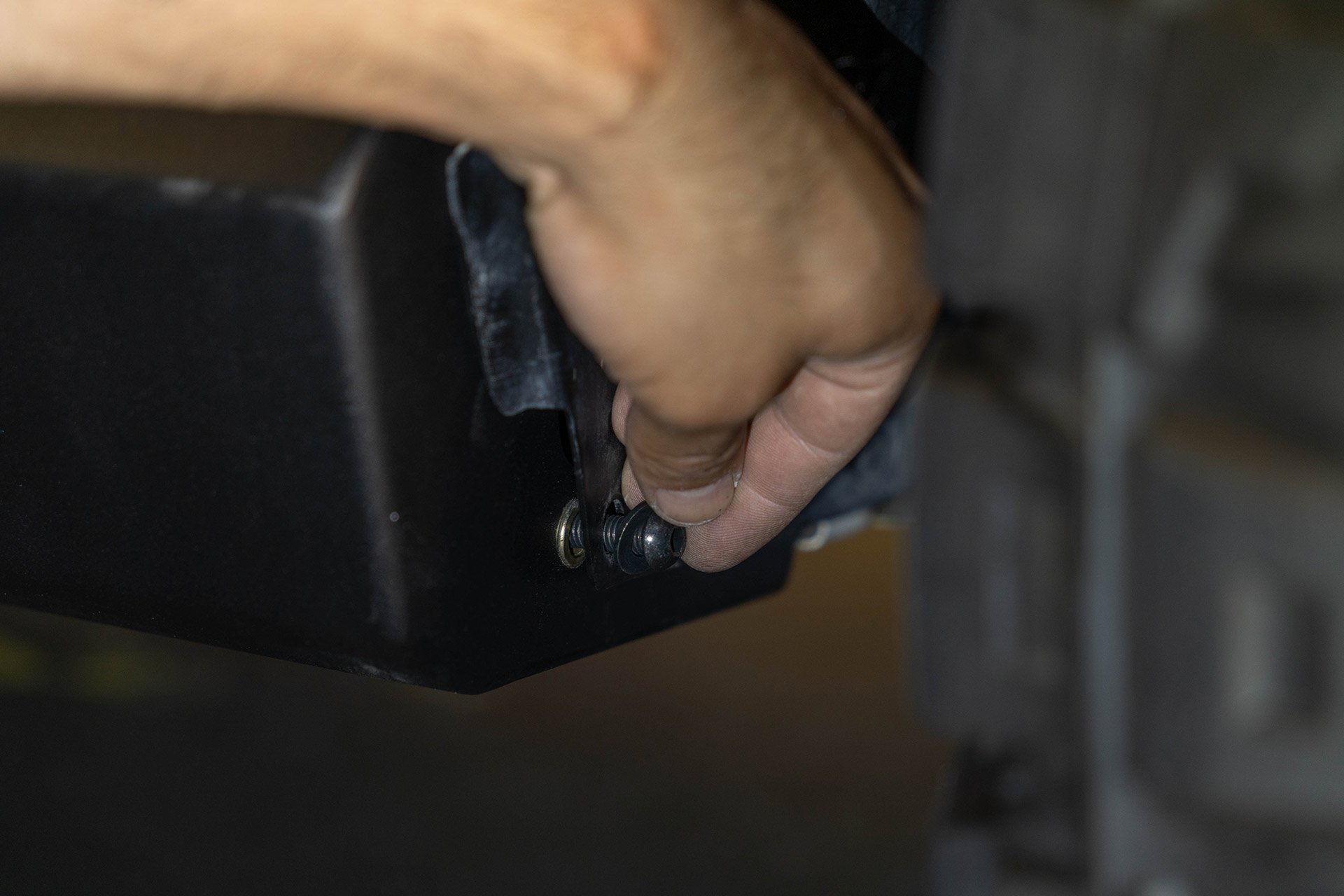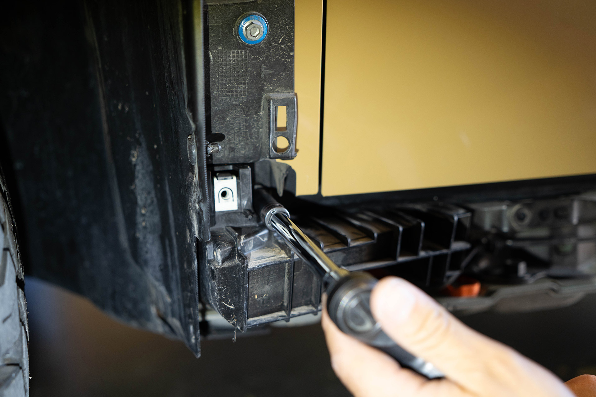 Next, install remaining factory push clips to secure the fender liner to the rock slider. Torque to 8 ft/lbs.
