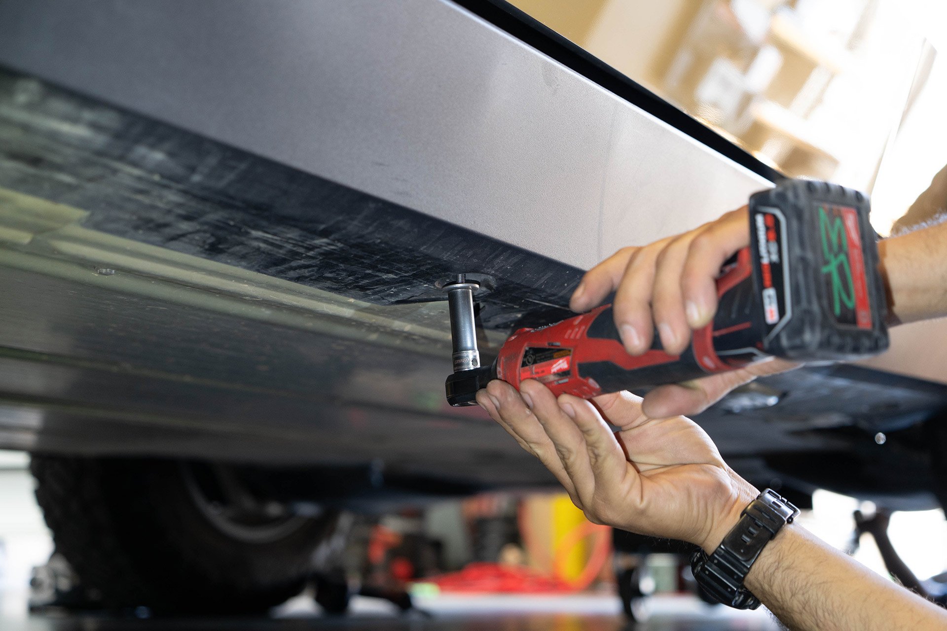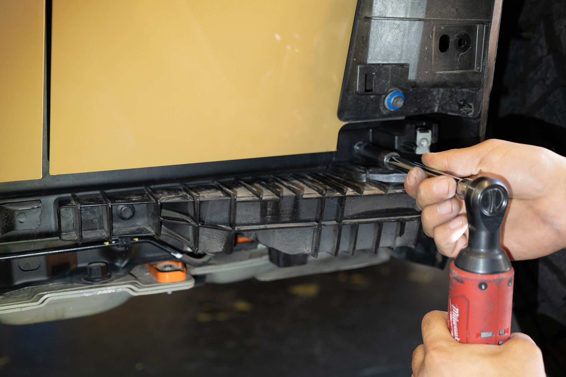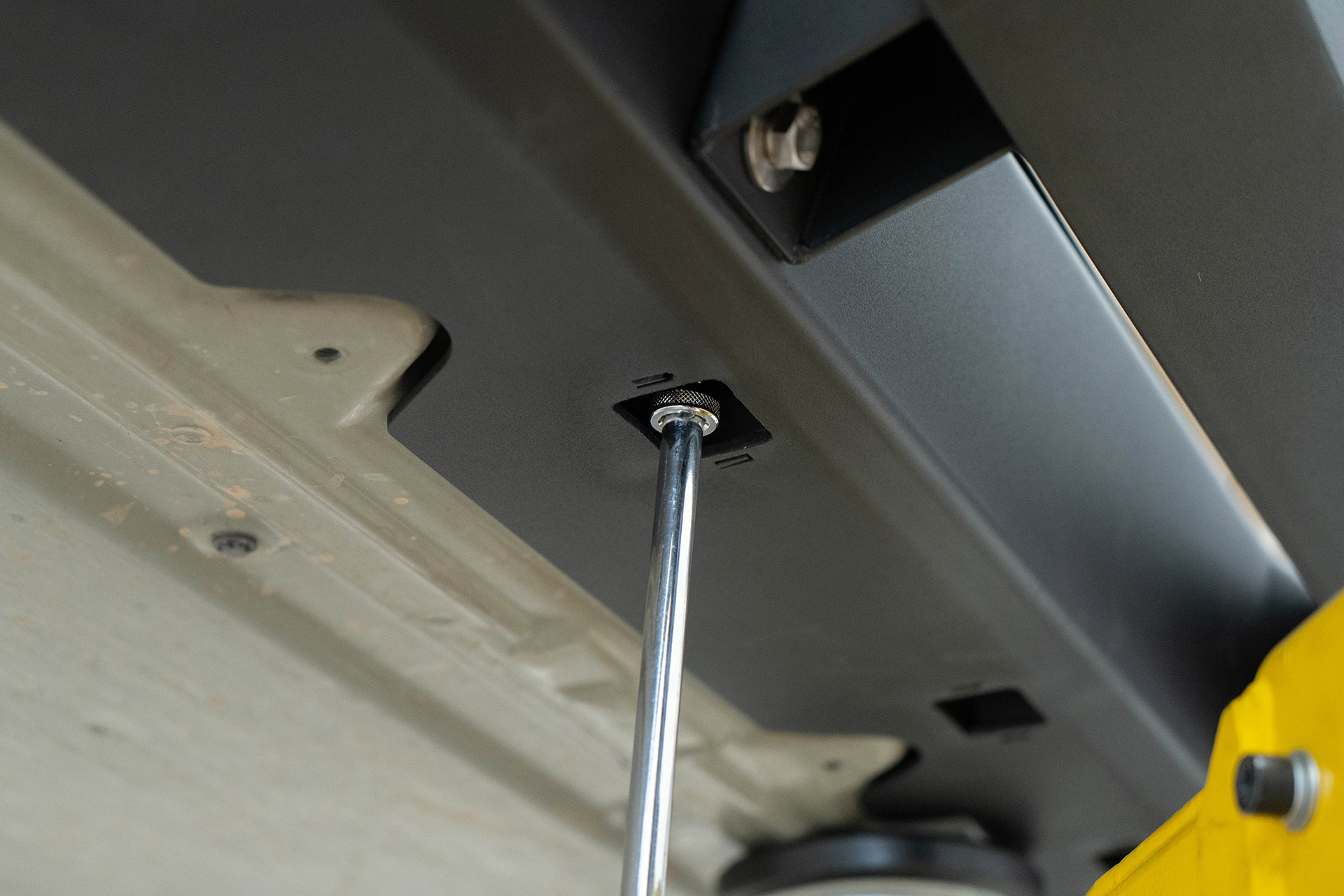 Next, using a 15mm socket, apply final torque to the 8 bolts securing the bottom of the rock slider to the vehicle.