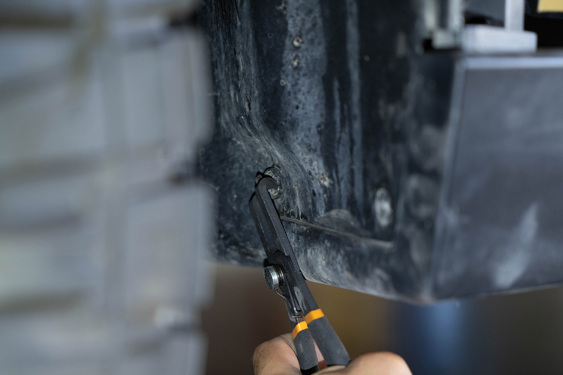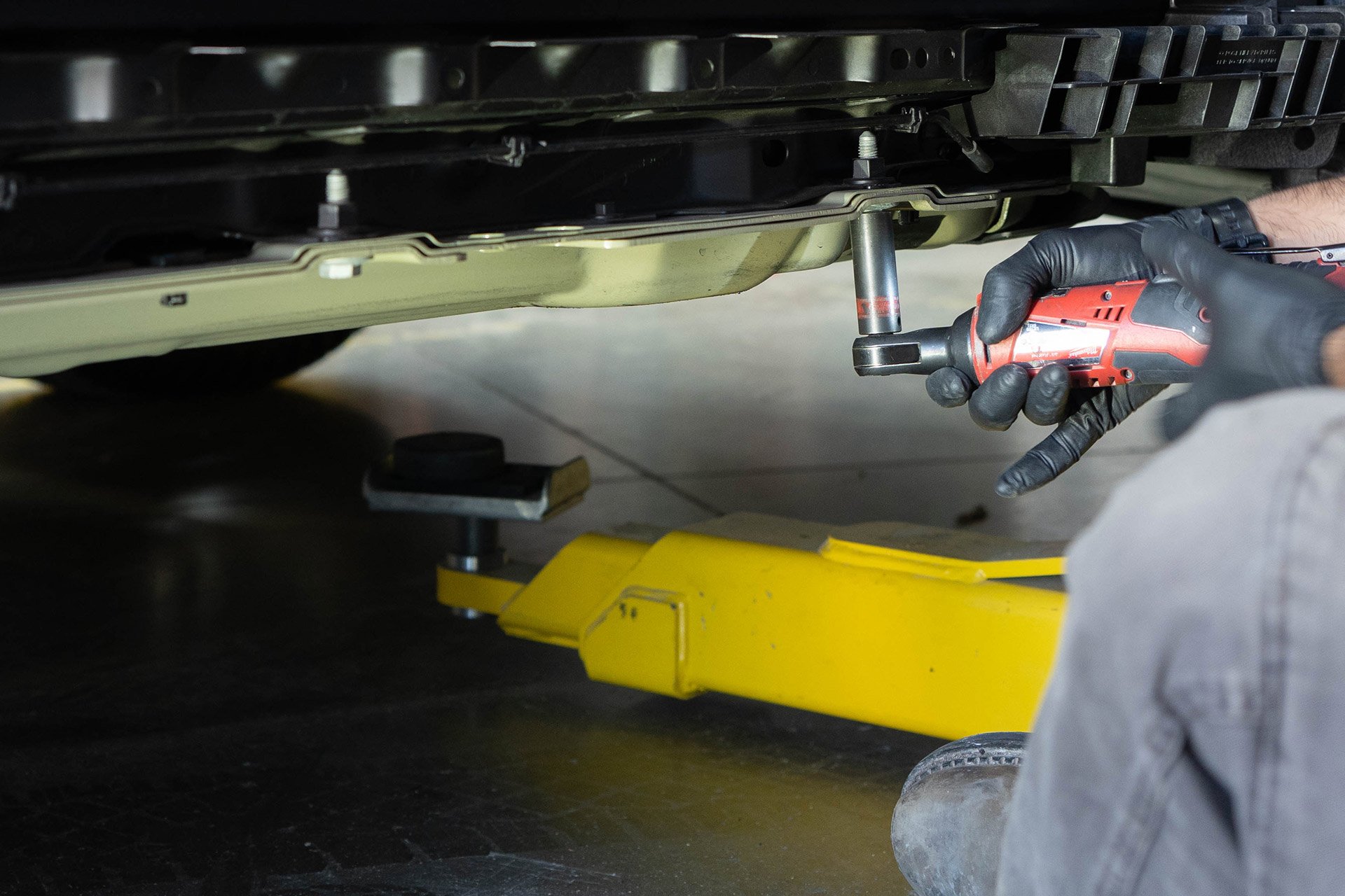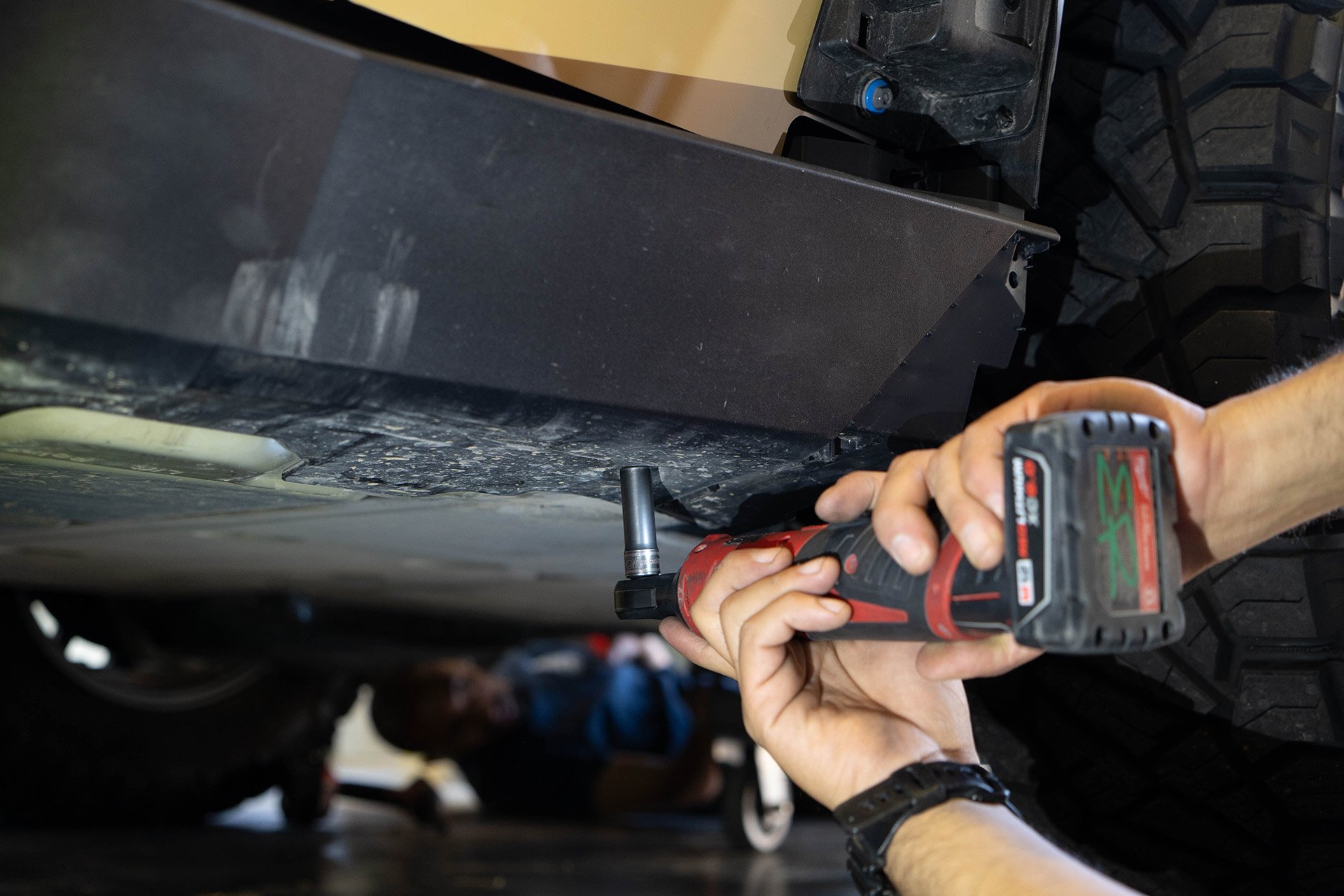 Next, using a 15mm socket, apply final torque to the 8 bolts securing the bottom of the rock slider to the vehicle.