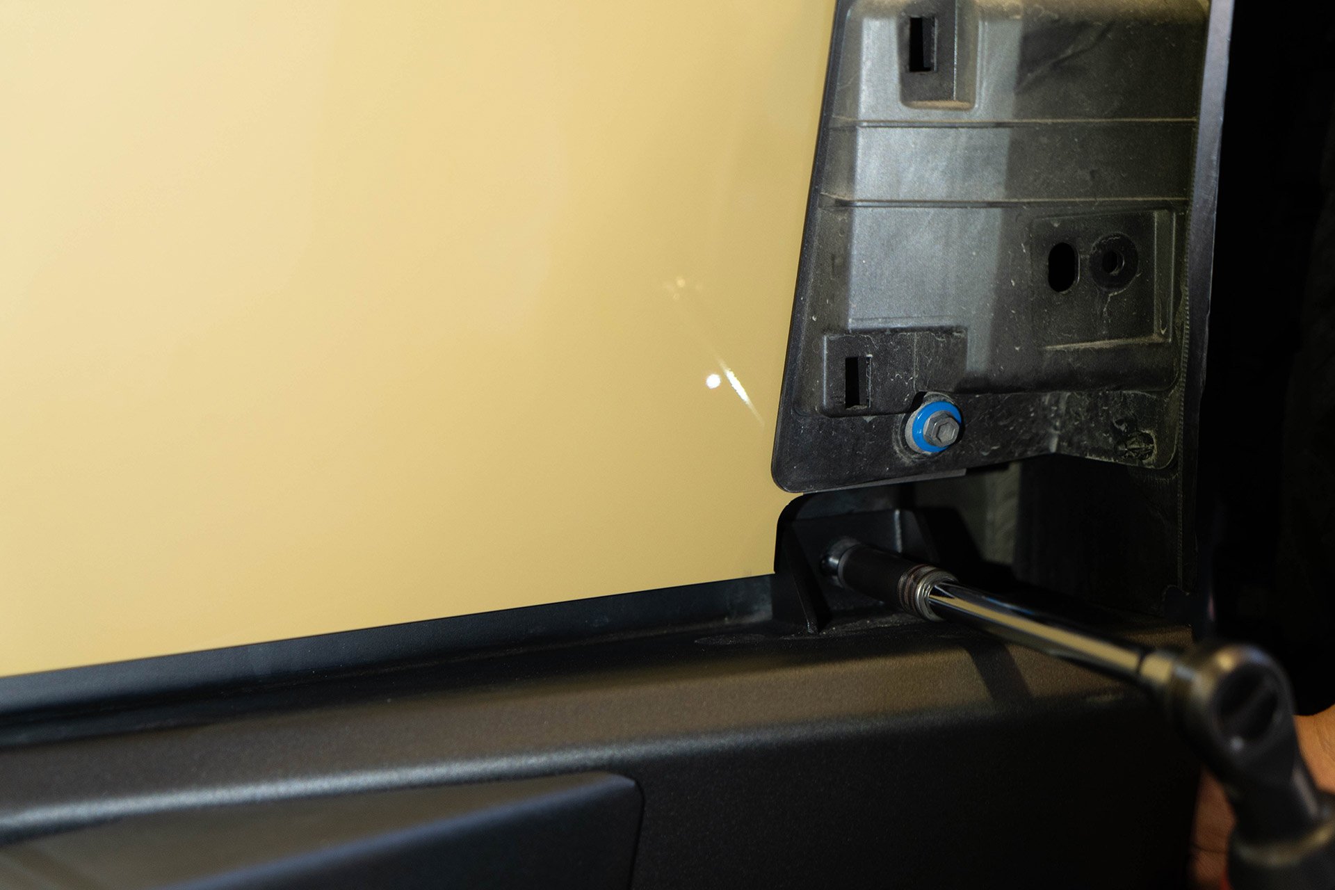 Using a 10mm socket, reinstall 1 factory bolt on each end of the side skirt near the bottom of the wheel arches. *DO NOT APPLY FINAL TORQUE*