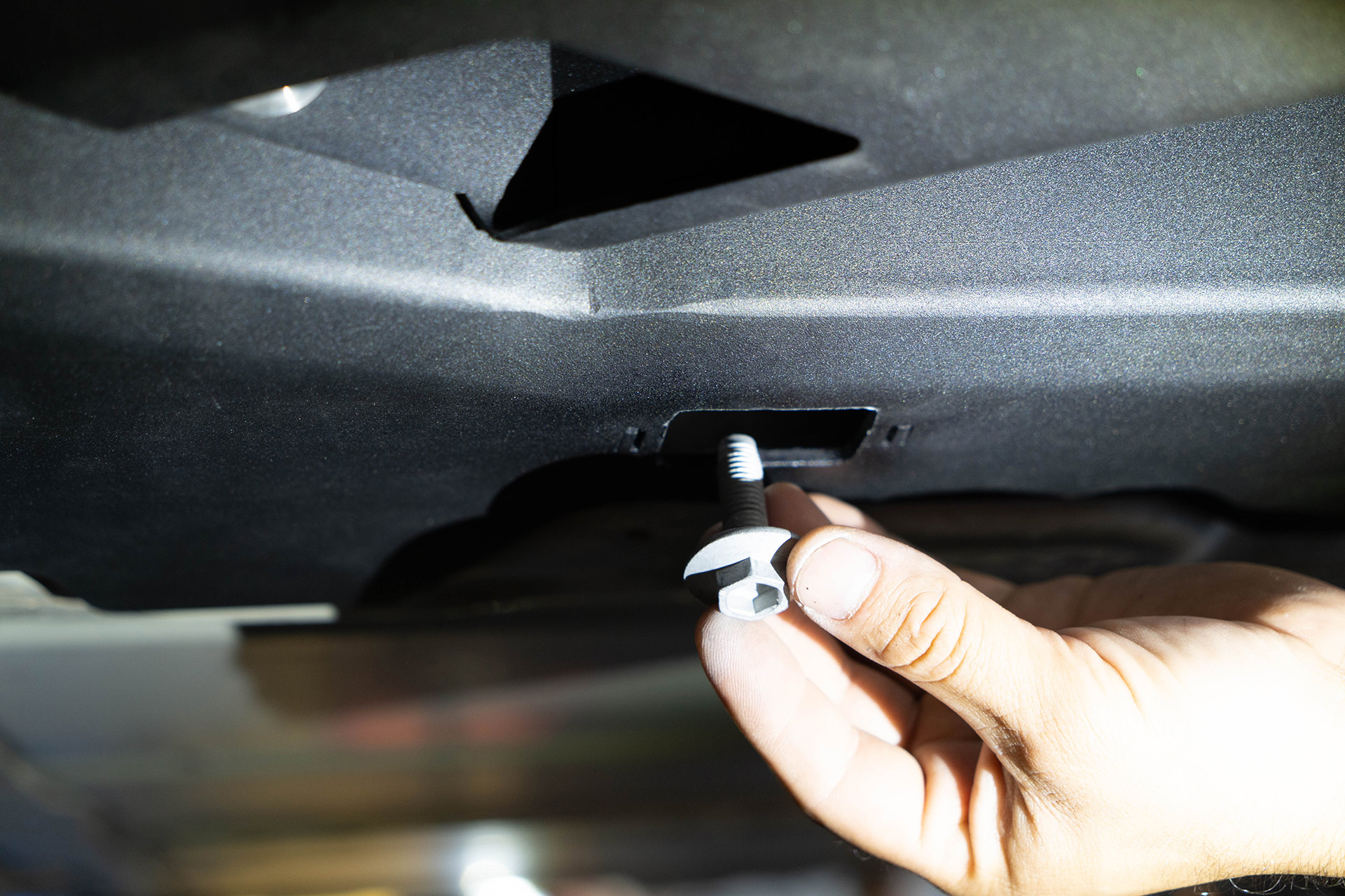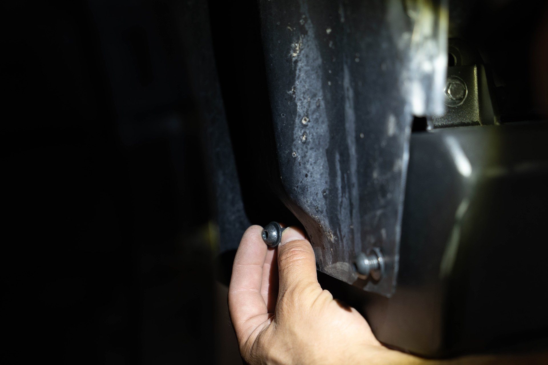 Using a 10mm socket, remove all 5 bolts securing the bottom of the OEM side skirt to the vehicle.