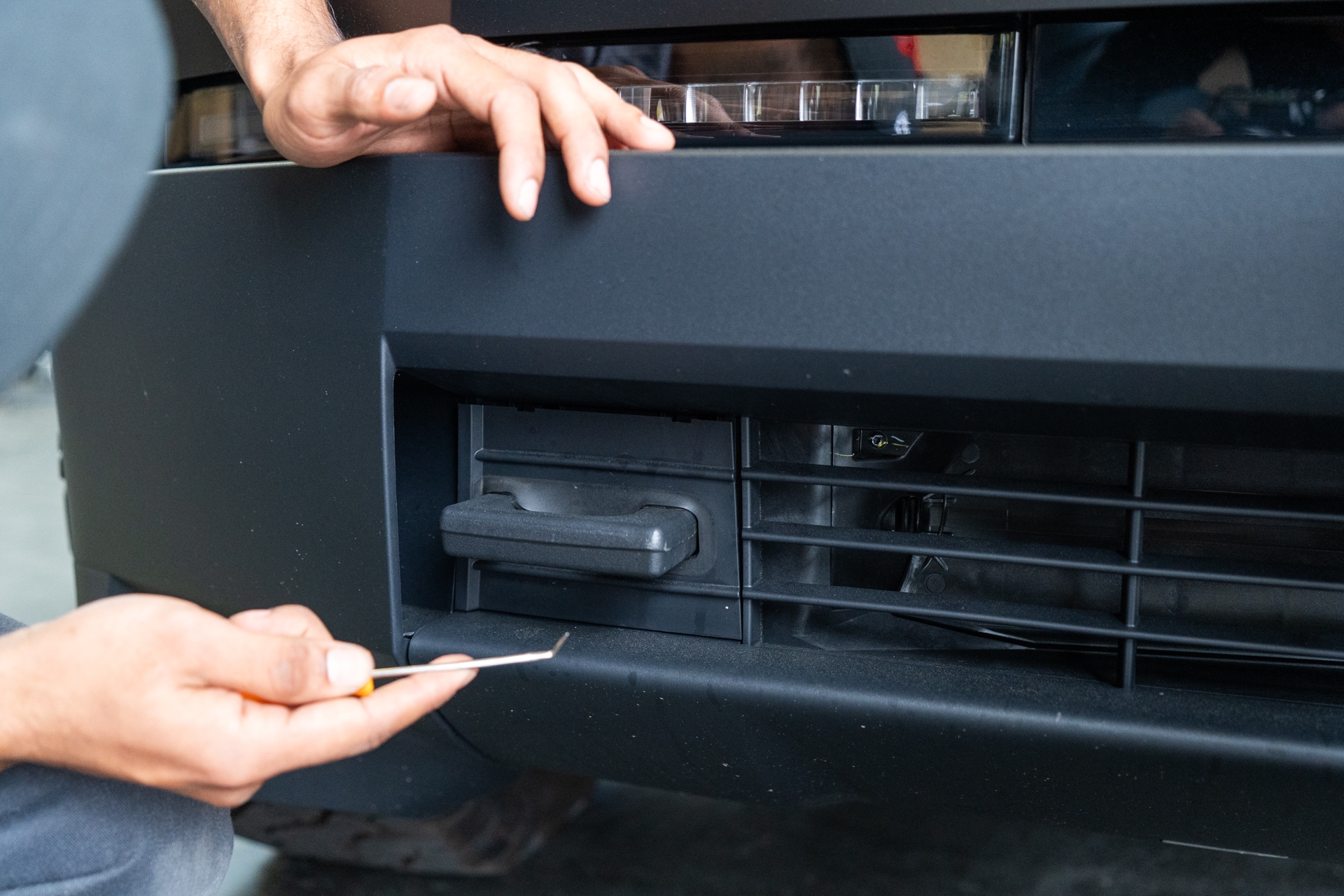 Using a clip removal tool, remove the front tow hook covers by pulling away in a swift like motion.