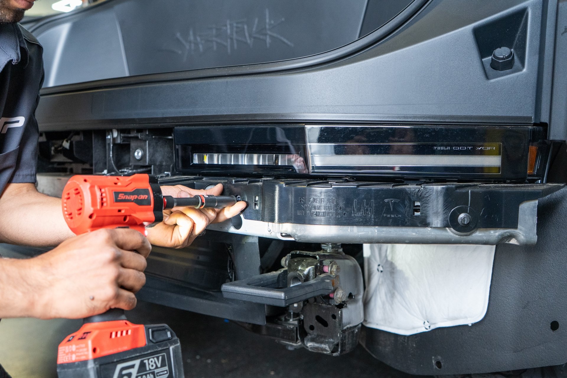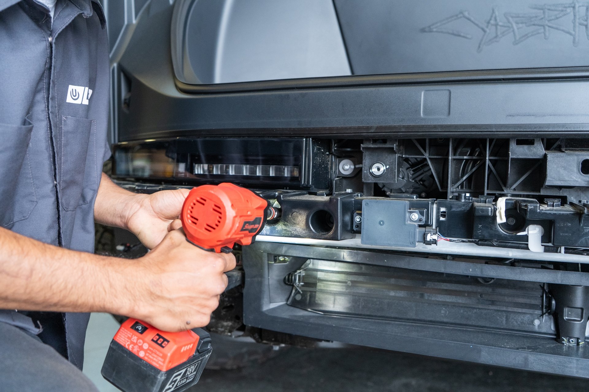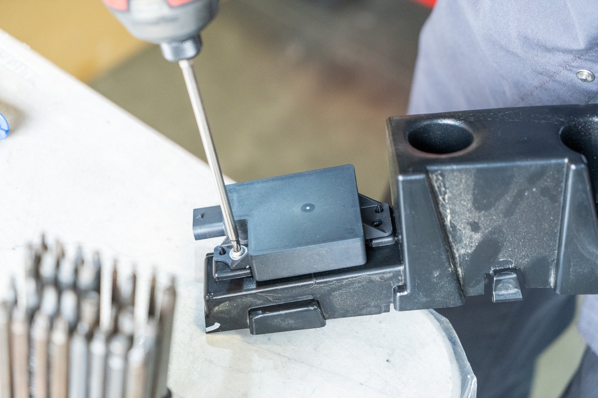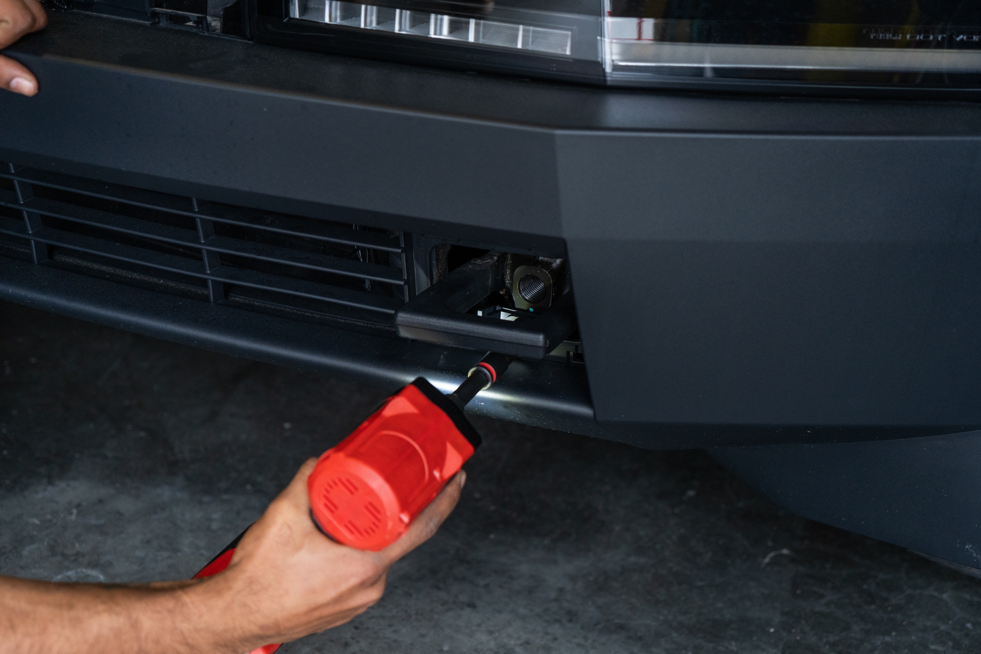 Using a T10 torx bit, fasten 4 tapered bolts to secure the UP camera housing to the UP invincible front bumper.