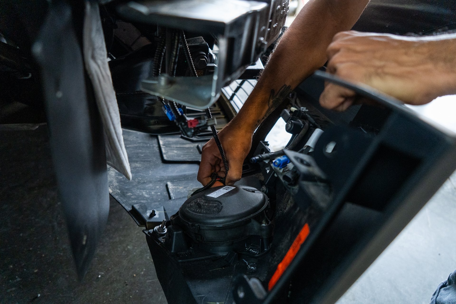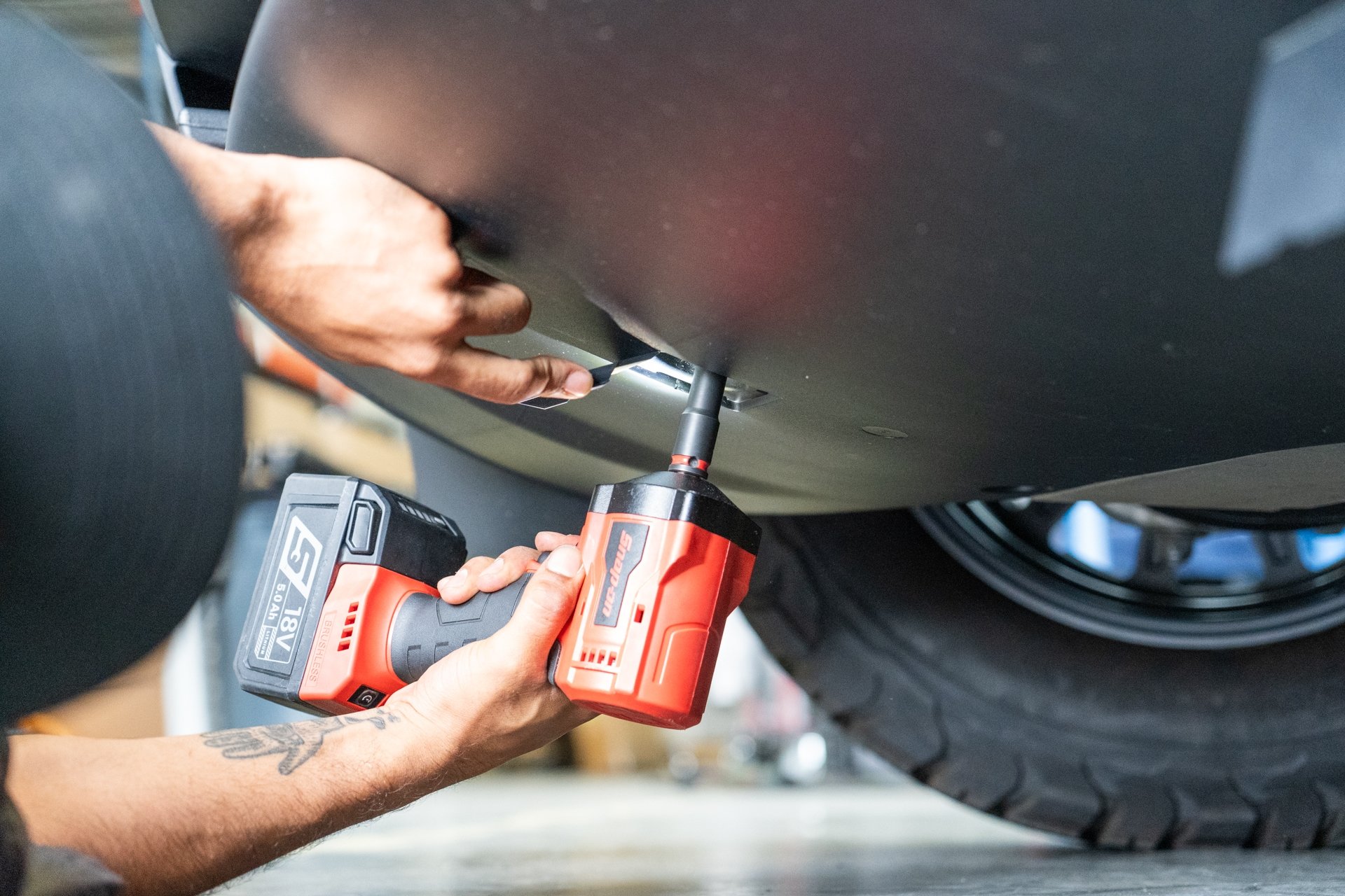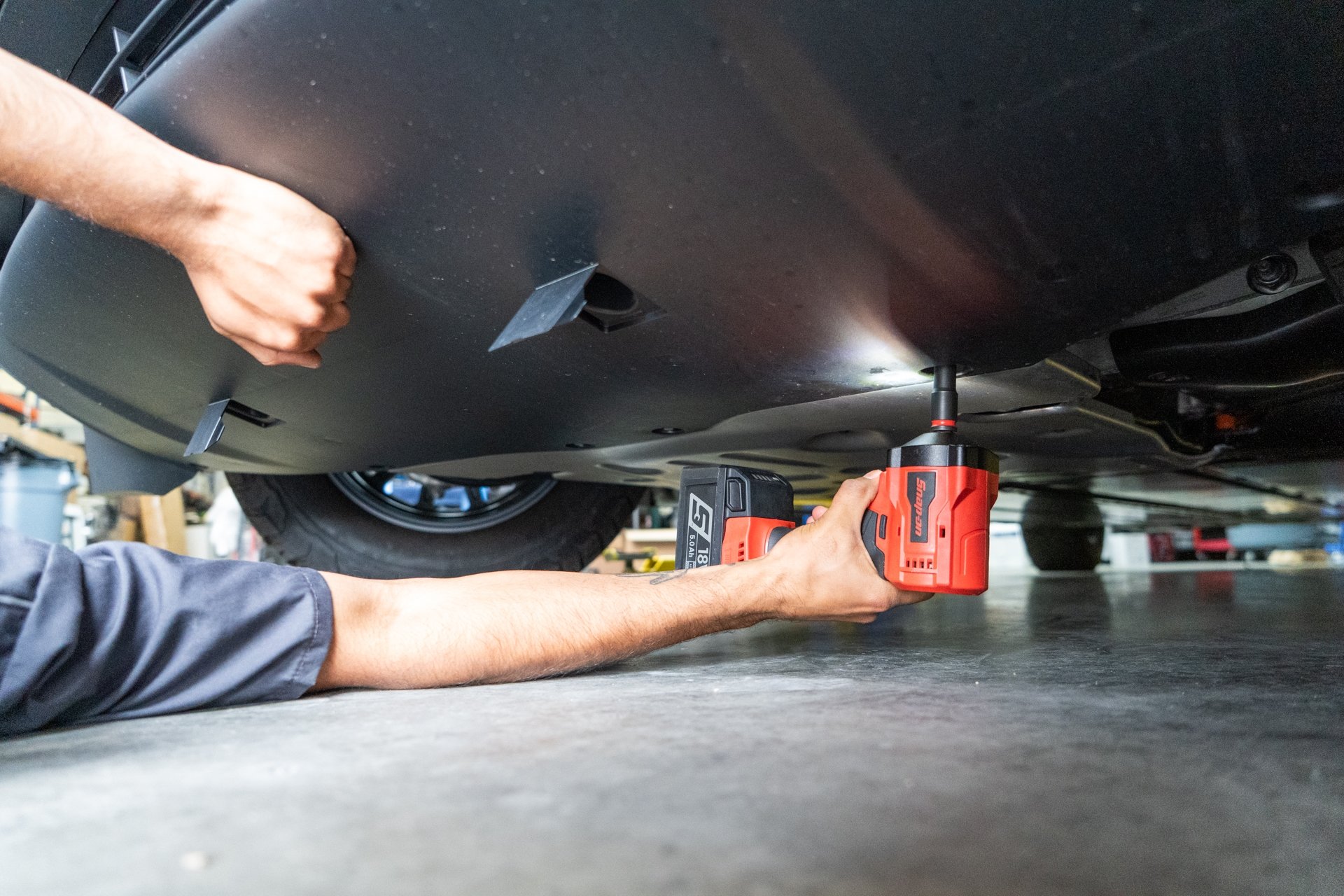 Place the truck in the highest setting and place the truck into jack mode. This is a safety measure to make sure that the ride height does not change while servicing the vehicle, while also providing additional clearance to some necessary access points.