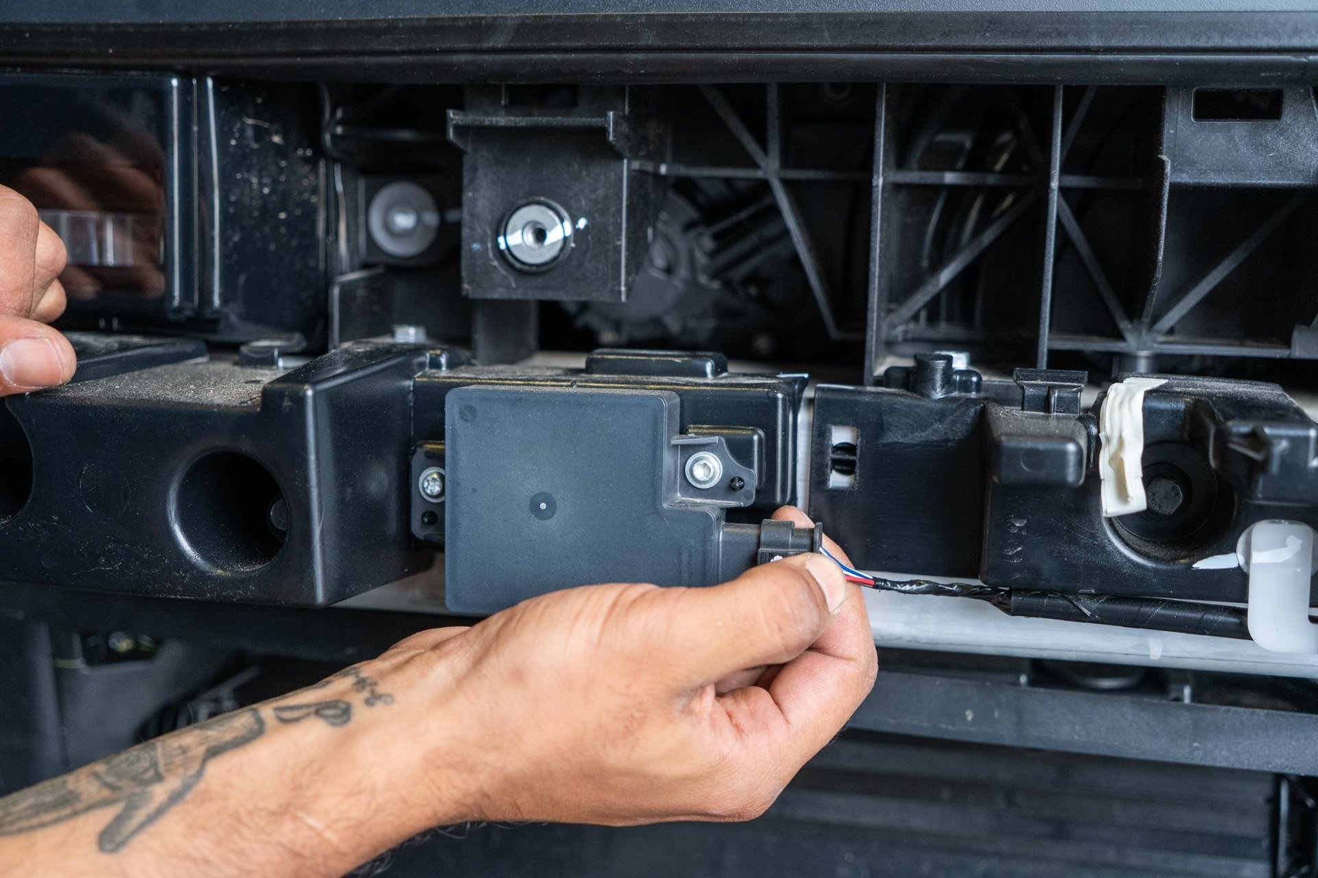 Next, using a 10mm socket, remove the Bluetooth sensor trim housing by removing all 11 bolts securing the trim piece to the factory crash beam. Note that the bluetooth sensor wiring harness must be disconnected before the housing trim piece has been removed from the crash beam, as well as the driver side wiring harnesses need to be removed using a pry tool before the bluetooth housing trim piece can be removed.