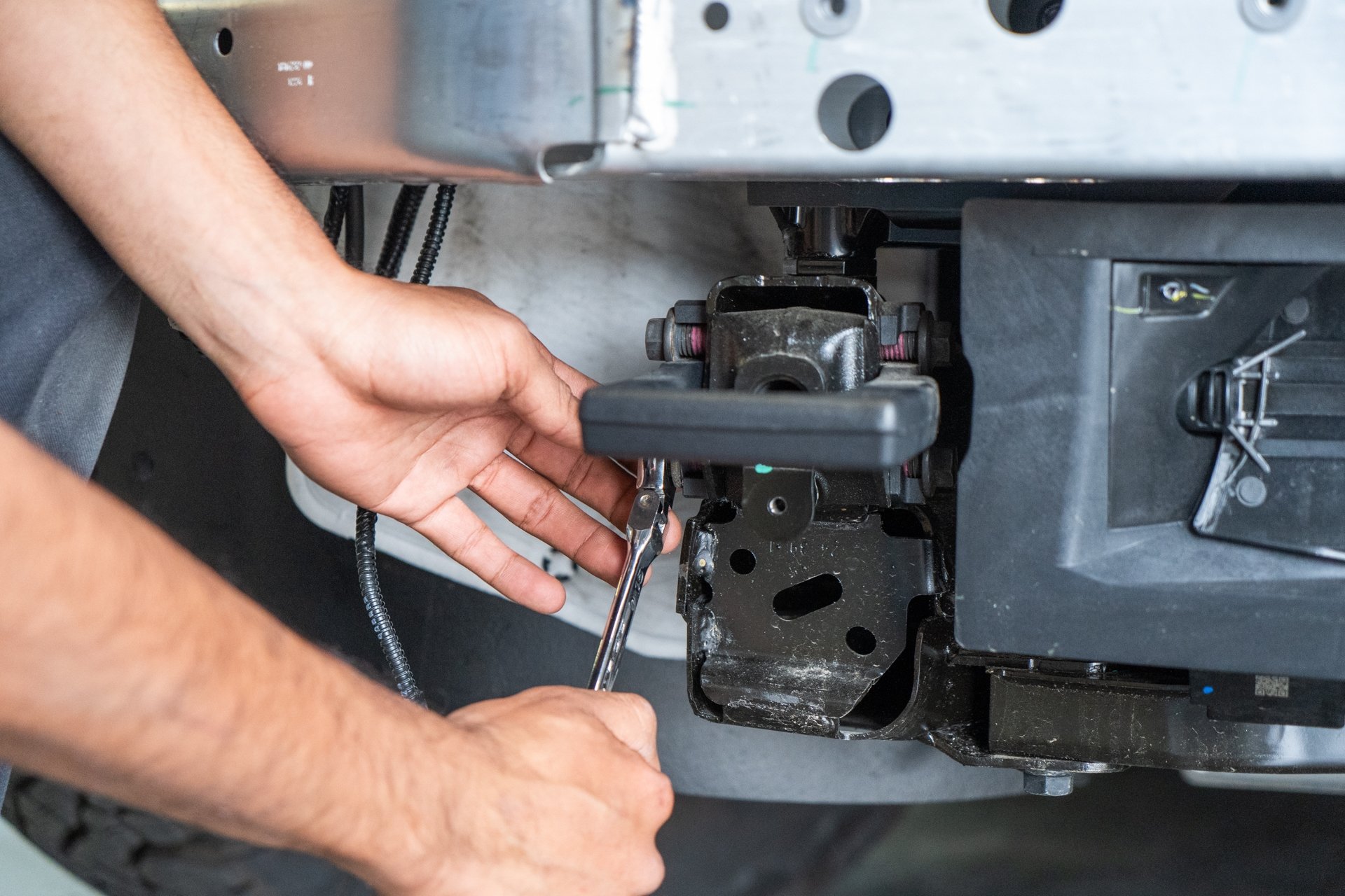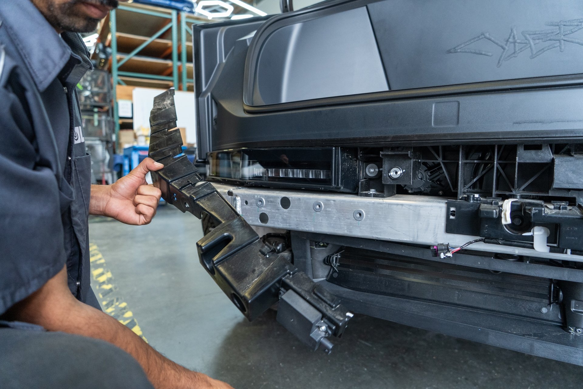 Using 2 people, slide the UP invincible bumper over the up invincible bumper mounts as shown below. Be sure to clear all wiring harnesses out of the way to mitigate damages. You may use the UP INVINCIBLE front bumper mounts to guide the UP INVINCIBLE bumper onto the vehicle.