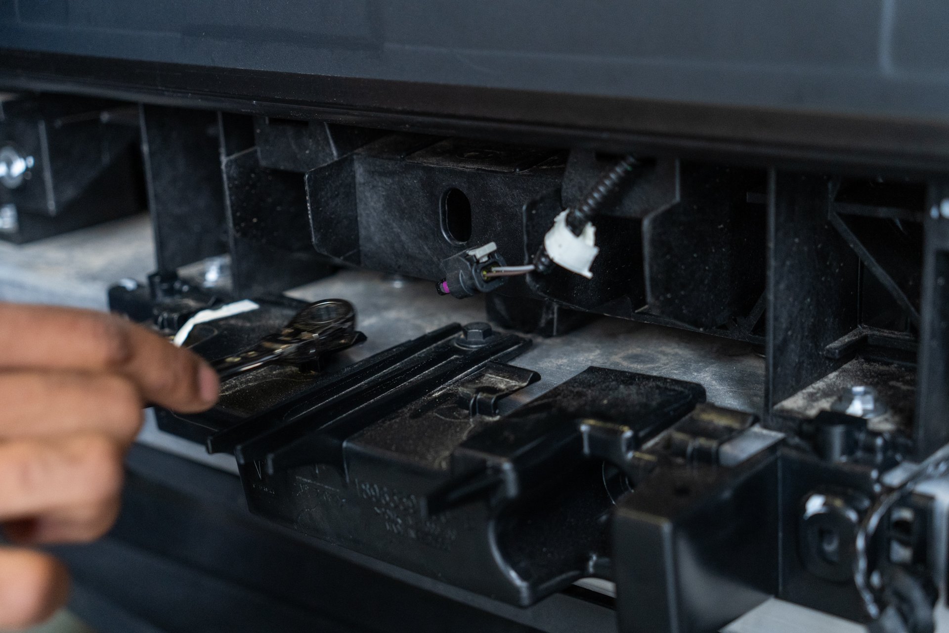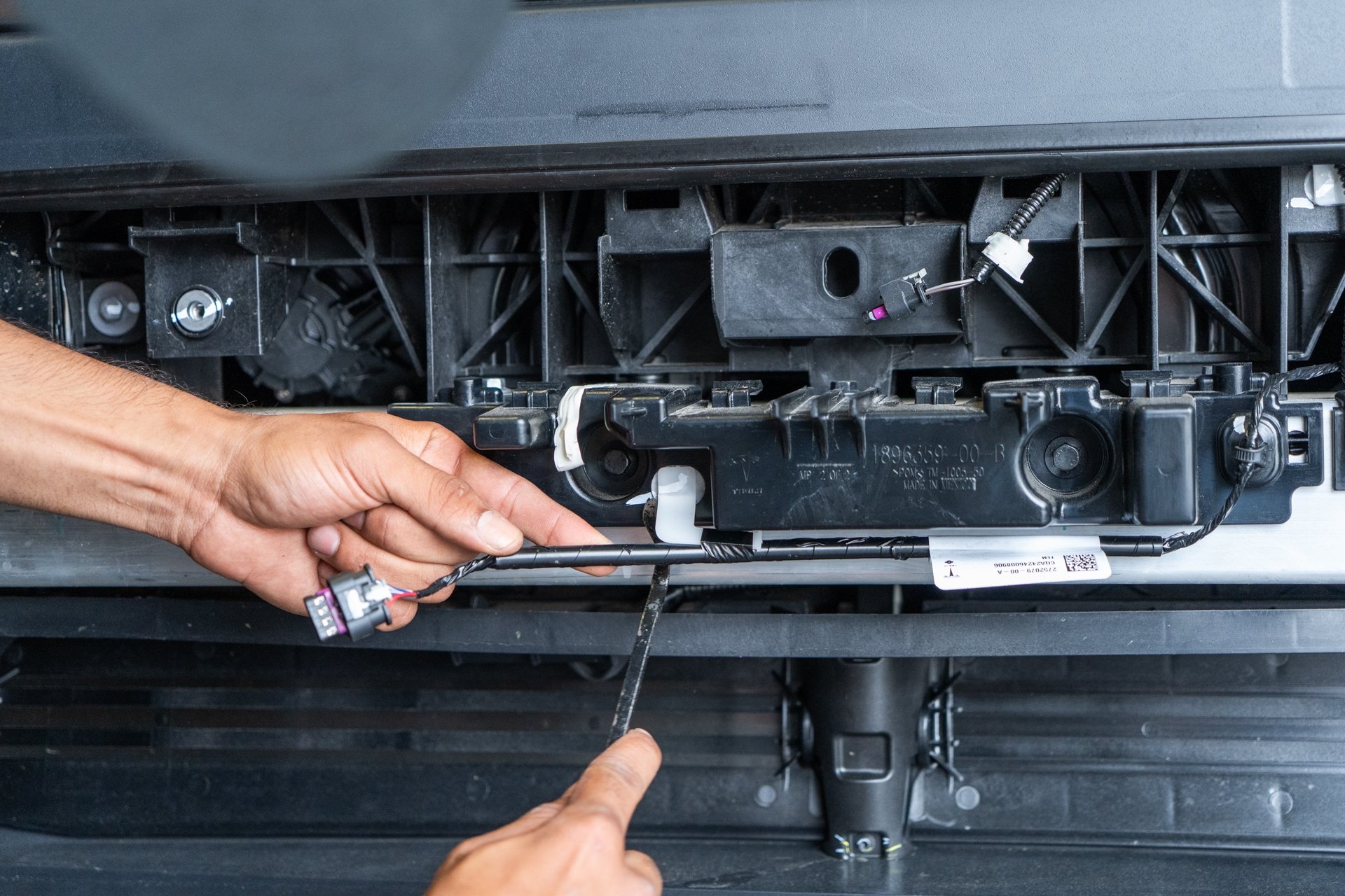 Resecure the factory camera power line and hose to the water jet and camera housing. Once done, slide the front bumper toward the vehicle for proper fitment and to release pressure from the camera power cable.