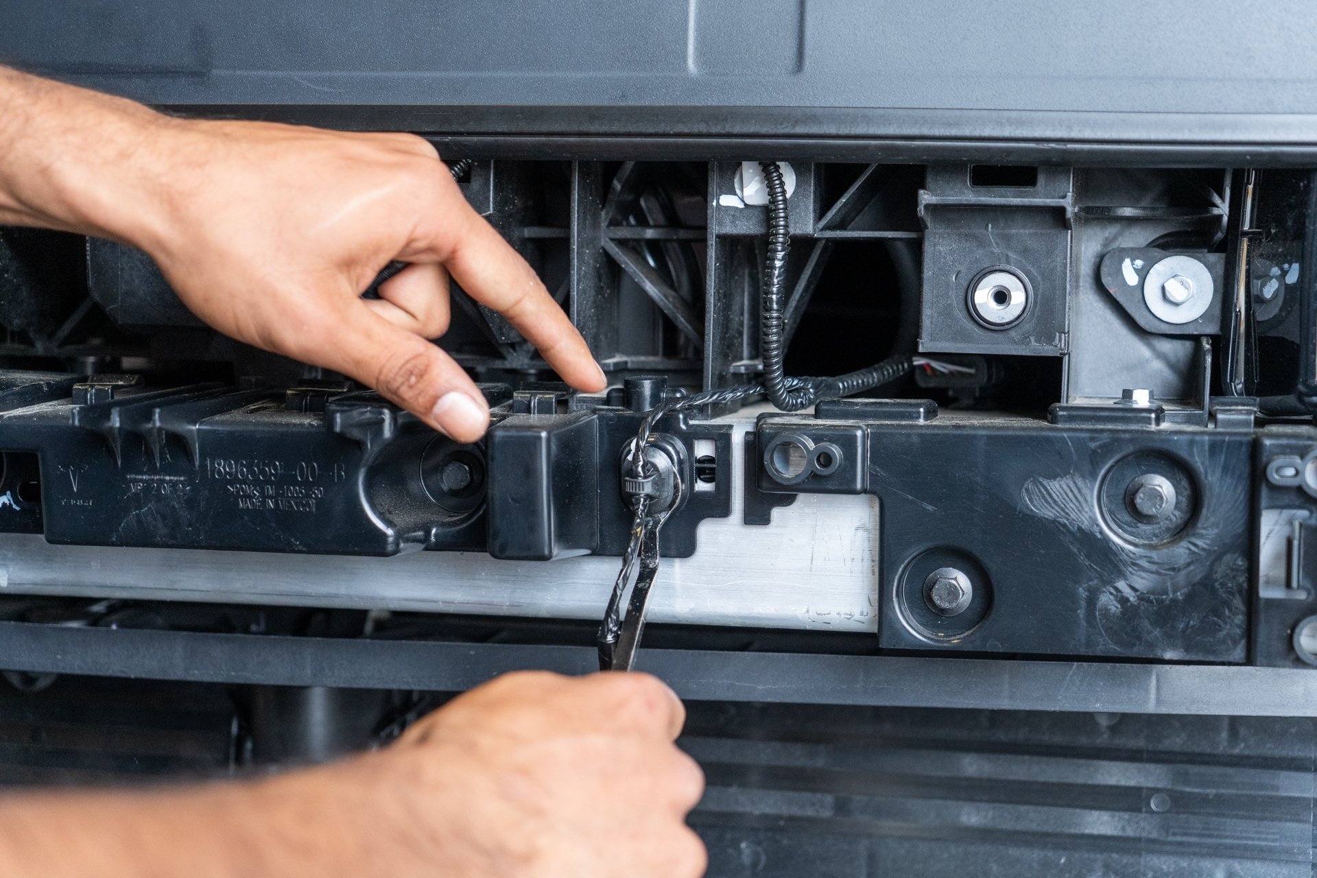 Once the front trunk assembly has been removed, locate the factory front trunk power assembly cable assembly located near the passenger side of the front radiator.
